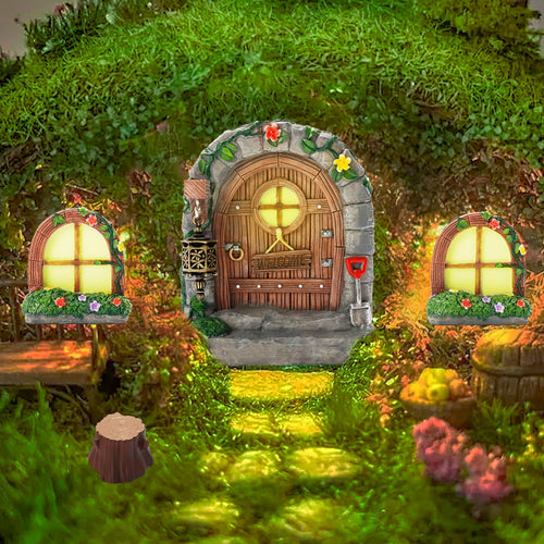Exasinine 6 Pcs Fairy Door and Windows for Trees Glow in The Dark Fairy Doors Miniature Fairy Garden Accessories for Wall Tree Fairy Garden Outdoor Decor with Tree Stump, 2 Fairy Lanterns