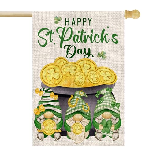 FUYUCHEN St Patricks Day House Flag 28x40 Inch Double Sided Gnomes Shamrocks Lucky Clovers Welcome Holiday Yard Large Garden Flag Outdoor Decoration