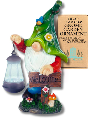 G&H Decor - Solar Gnome Decoration - Hand Painted Garden Gnome Solar with Amazing Detail - Funny Resin Solar Gnomes Garden Figurines for Outdoor - Gnome Solar Lights with Welcome Sign (Lantern)