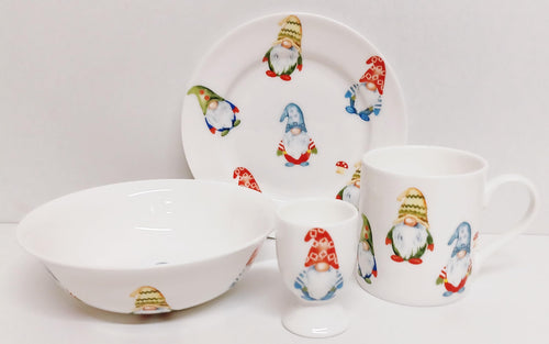Lucky Gonks Breakfast Children Bone China Set, Plate 16.5 cm, Mug, Bowl & Egg Cup, Festive Children's Kids Gnomes, Hand Decorated in UK
