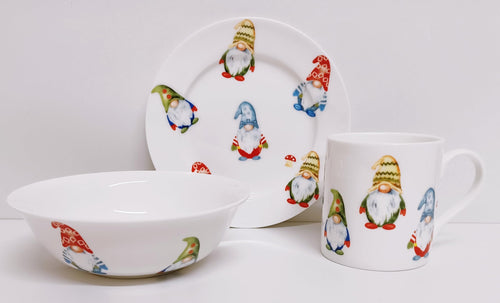 Lucky Gonks Breakfast Children Set Bone China 3 Piece Plate 16.5 cm Mug & Bowl Festive Children's Kids Gnomes Hand Decorated in UK