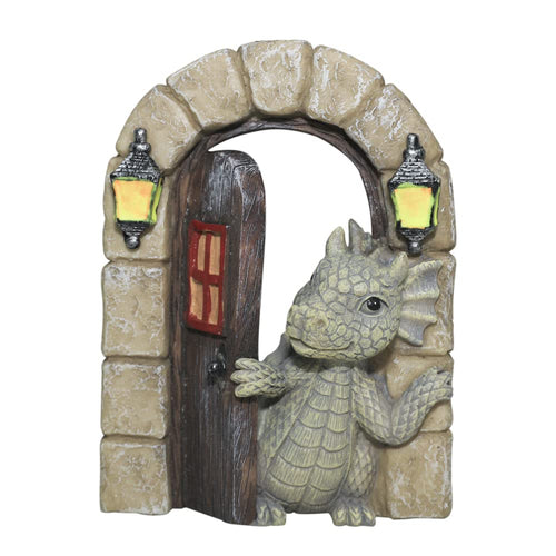 SHOWFEICAT Dragon Garden Ornament Resin Craft Ornament Statue Fairy Door Yard Art Outdoor and Garden Solar Light Luminous Sand Open Door Dragon Wall Statue Outdoors Decor (Open The Door)
