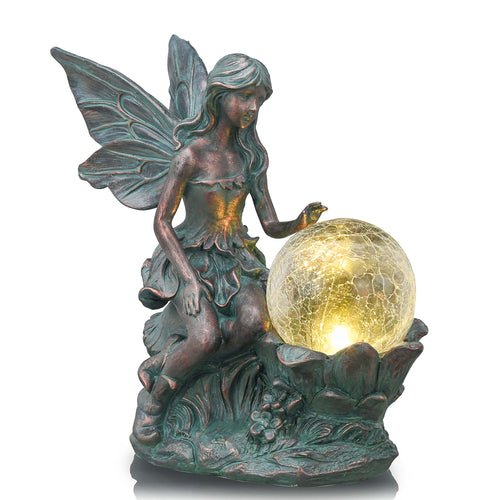 TERESA'S COLLECTIONS Fairy Garden Statues Outdoor Solar Light for Outdoor Decor, Patina Bronze Fairy Resin Garden Decor Sculptures with Crackle Glass, Lawn Ornaments Yard Decor Gifts for Mom, 12.4"