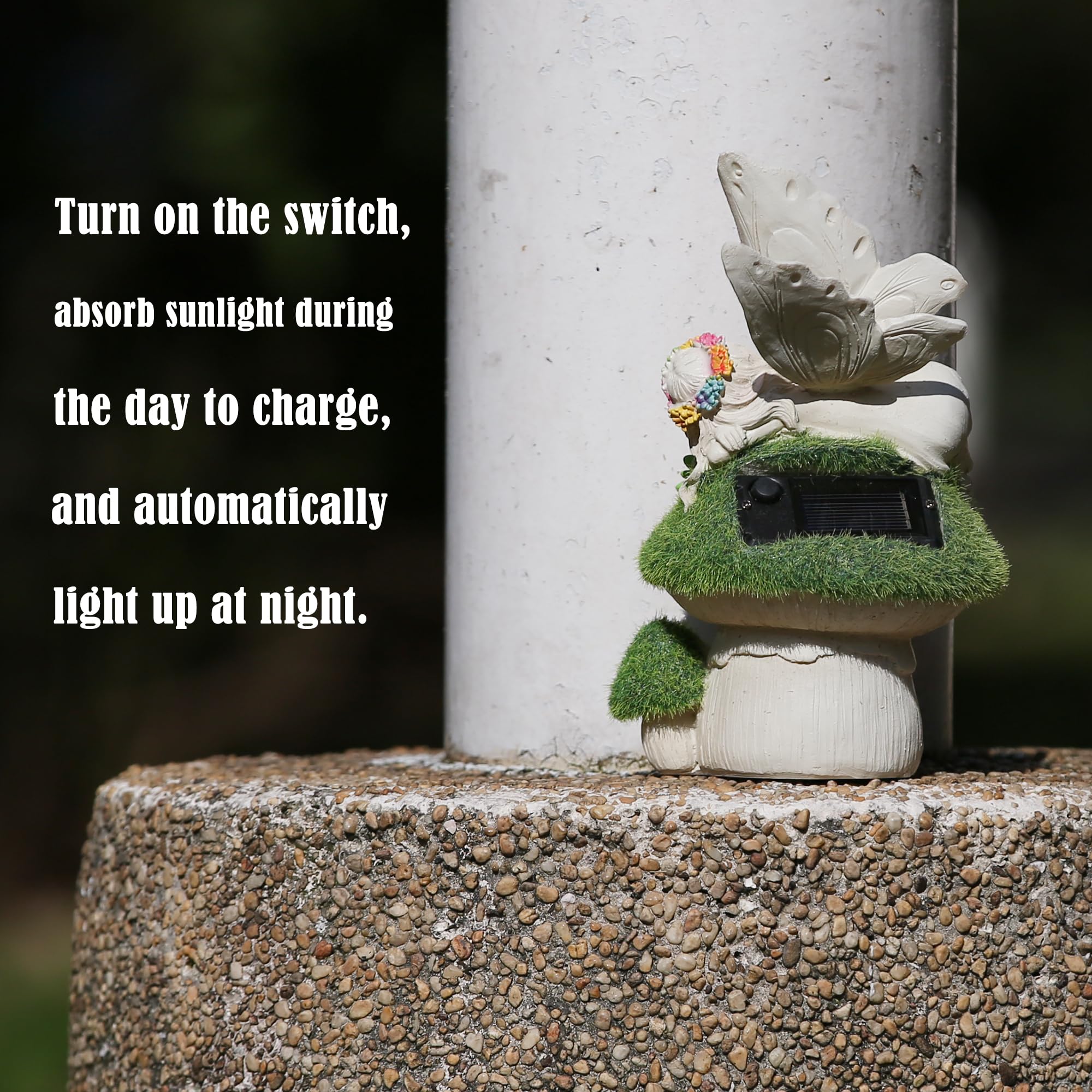 - Unique Design This 7.6 inch tall fairy statue is very beautiful. She sleeps soundly on the raised lawn, everything is so peaceful and harmonious. The solar decorative lights on the flowers automatically emit dazzling light at night, bringing a harmonious fairy tale atmosphere. Such a vivid and interesting outdoor statue will be very eye-catching in your garden!