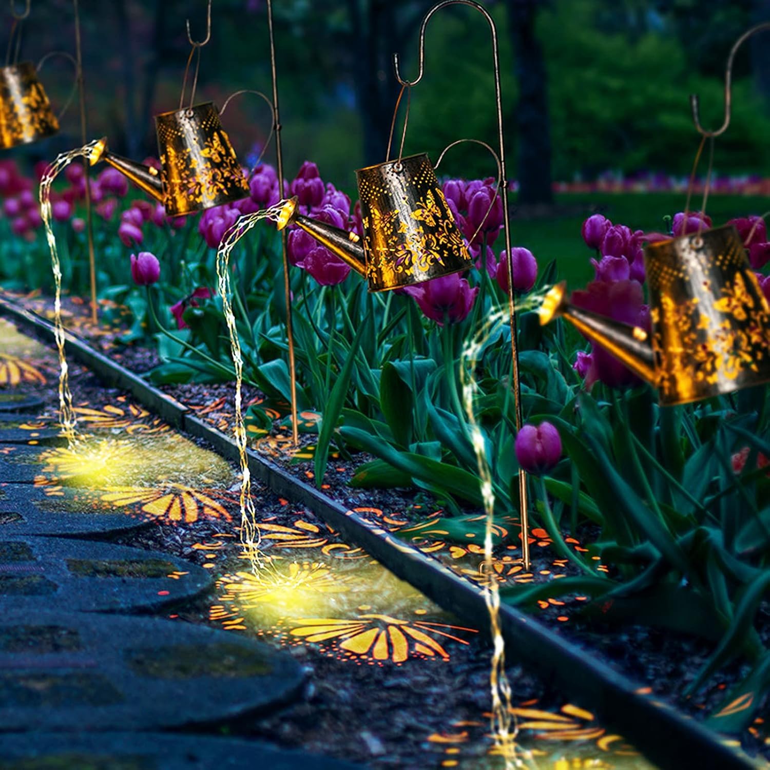 - [ARTISTIC SOLAR LIGHTS]: 🌟 Solar watering can with cascading lights are engraved with butterfly patterns. Hang the solar watering can lights in the garden or courtyard. At night, the butterfly solar lights will be automatically turned on and projected in the garden. When the wind blows through the watering can lights, the butterflies will shake and flash. , make your garden unique.