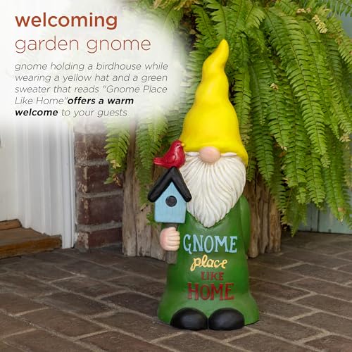 - WELCOMING GARDEN GNOME: Playful garden gnome holding a birdhouse while wearing a yellow hat and a green sweater that reads "Gnome Place Like Home" offers a warm welcome to your guests