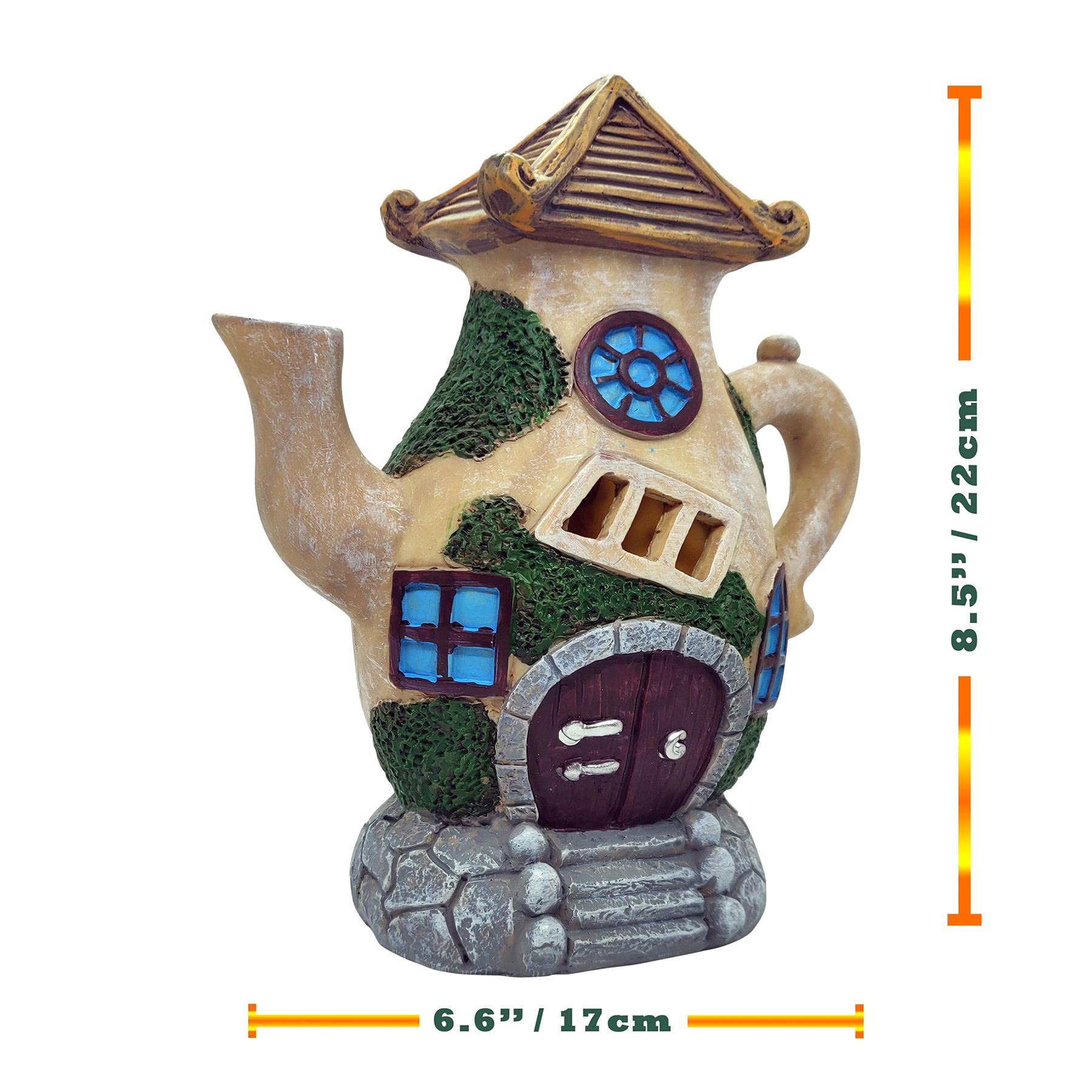 - SOLAR FAIRY TEAPOT HOUSE - Perfect addition to any magical neighbourhood inhabited by fairies. Let it provide an enchanted beam of light to your garden! Solar panel hidden on the back of the house can be switched on and off. Size: Widest point: 6.6inch (17cm) x Height: 8.5inch (22cm).