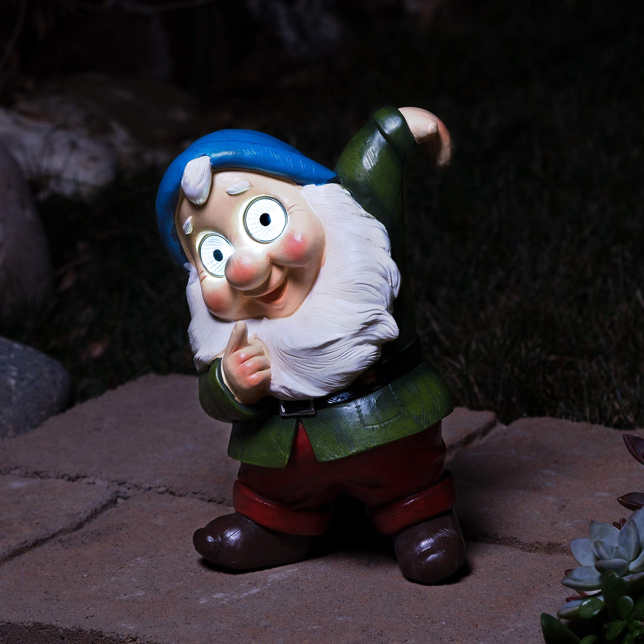 - GNOME PATIO DECOR: Inspire smiles with this laid back LED solar garden gnome. Enjoy the enchanting vibe that come from its cute LED eyes. Charm up your outdoor spaces with beautiful color and a whimsical vibe.