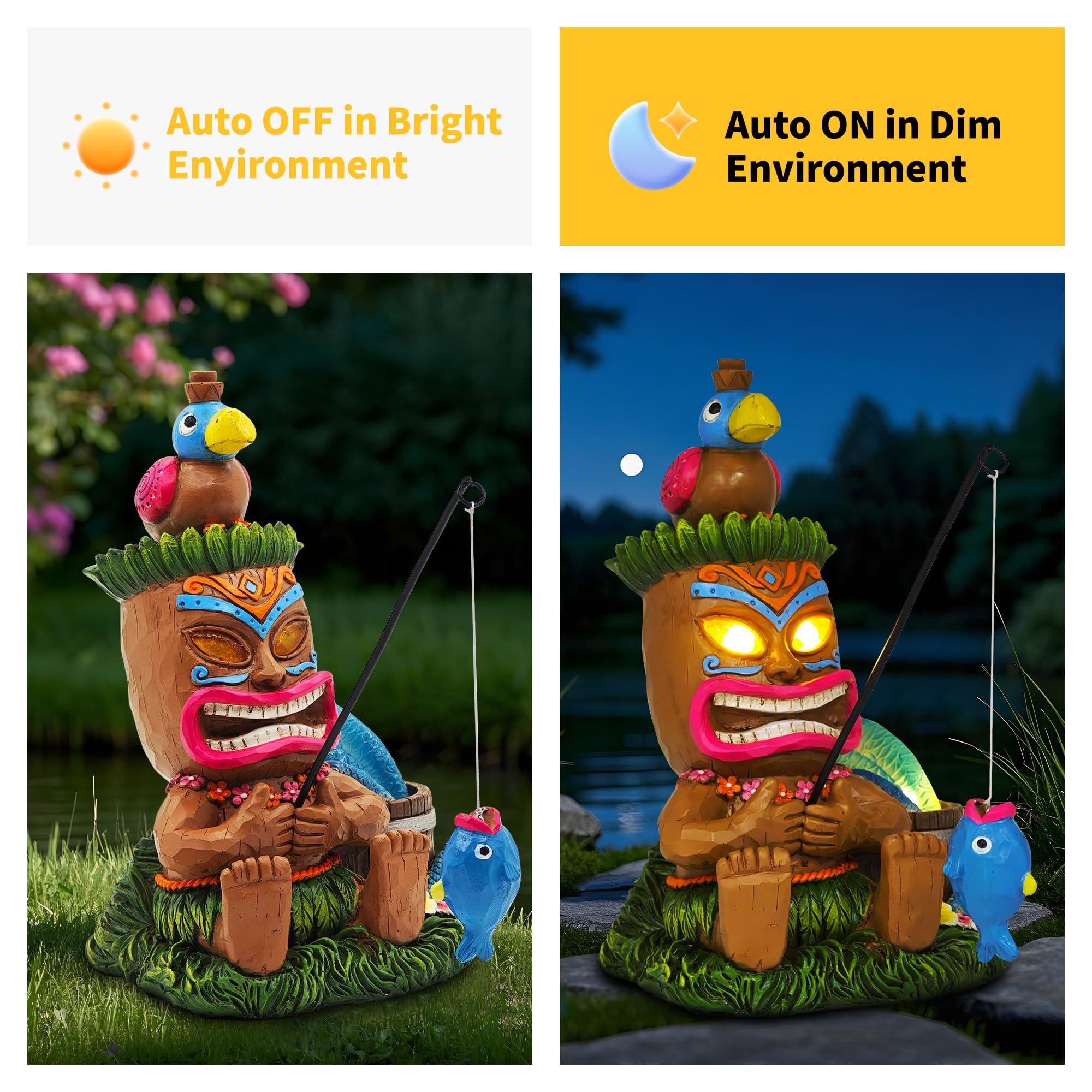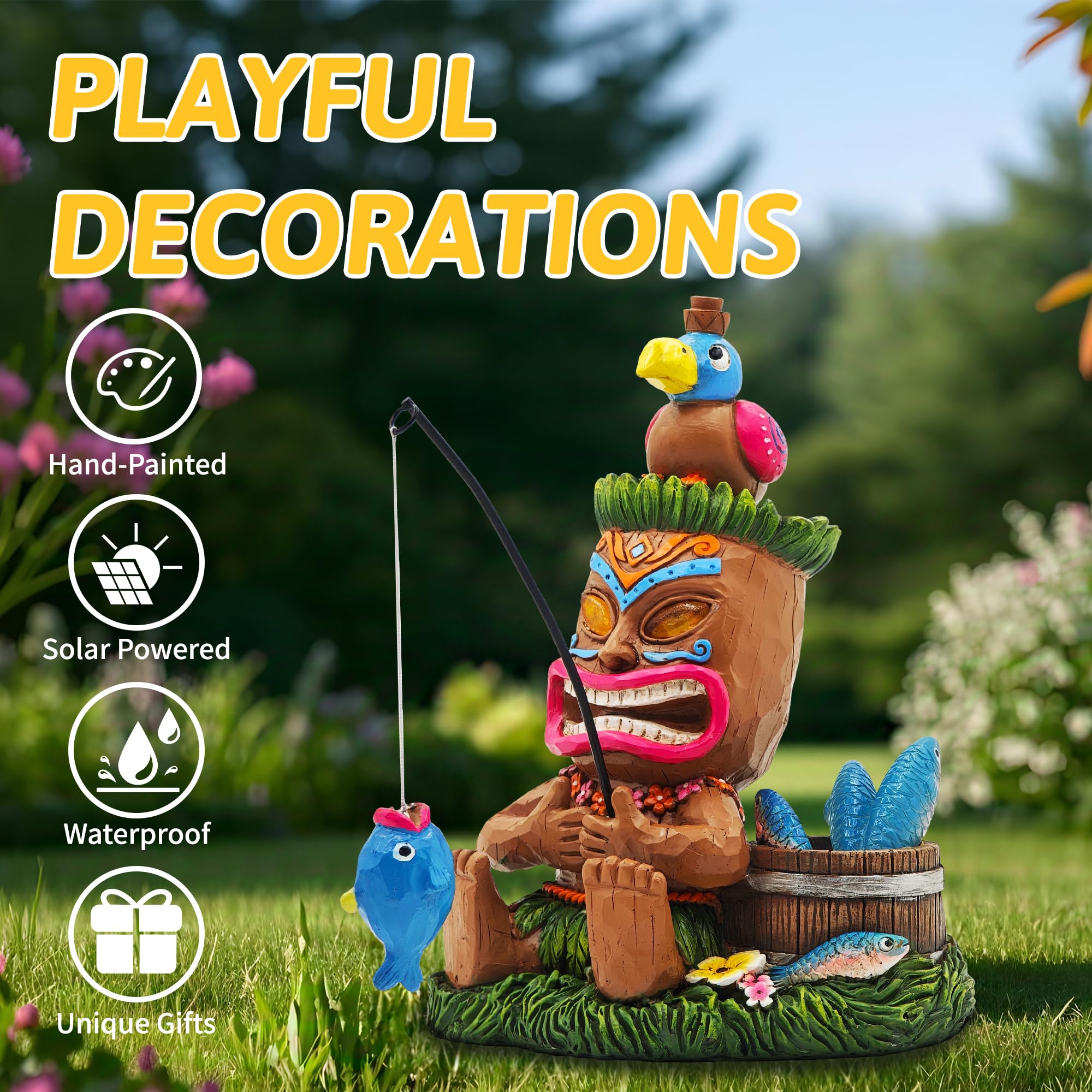 - 【Exquisite Handcrafted Durability】This adorable tiki statue comes to life with his fishing rod, a cheerful little bird perched on his head, and a bucket full of fish catch beside him. The tiki's eyes and fish in the bucket glow softly at night. Meticulously handcrafted from premium weather-resistant resin with waterproof sealing and UV-protective coating, it maintains vibrant hand-painted colors that withstand heavy rain, snow, and intense sunlight while resisting fading and cracking.