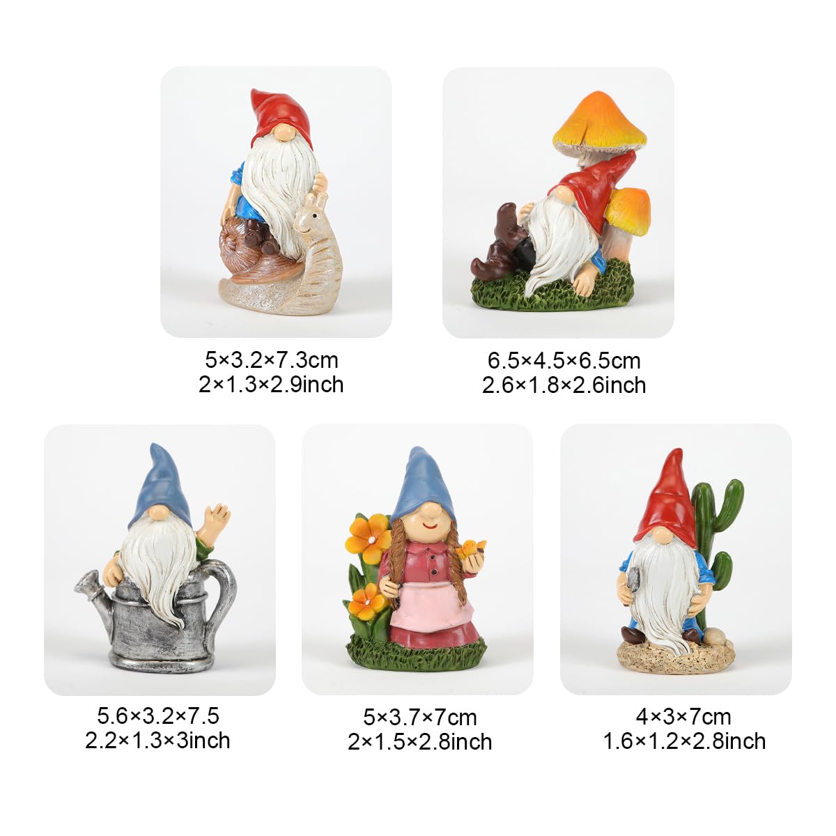 - 【Original Design】One flower gnome, one kettle gnome, one cactus gnome, one mushroom gnome and one snail gnome, these gnomes will live and play happily in your fairy garden. With the highly-detailed, bright, and attractive design, they will add a whimsical touch to your garden or your home!