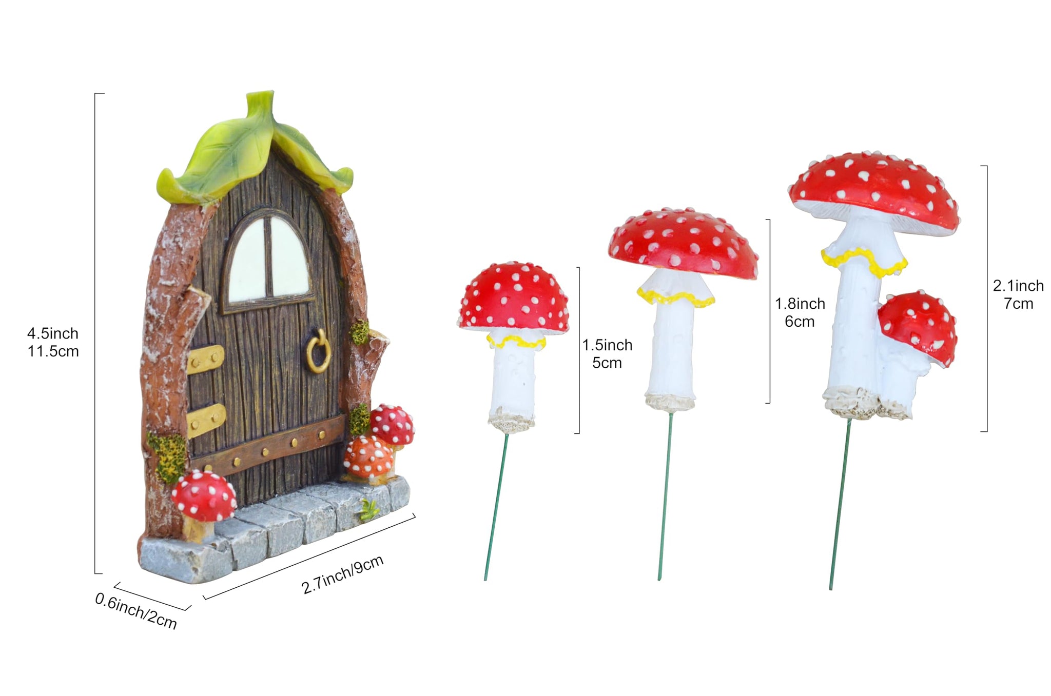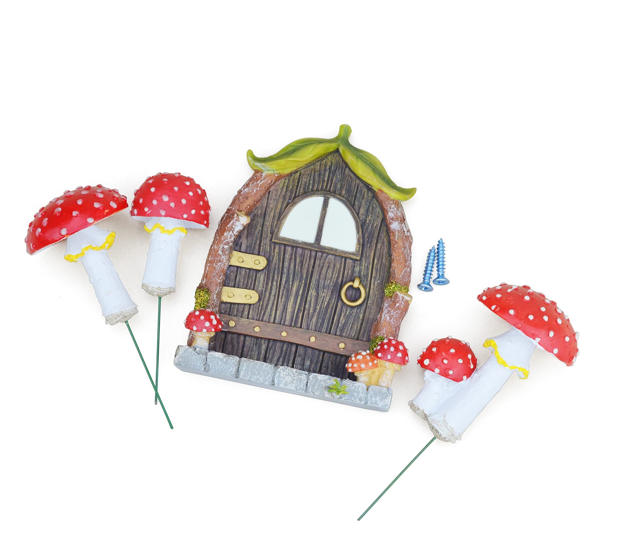 - 【Easy to Install】A screw is included with the fairy door kit for easy installment. There is a hook on the back of the door, with which you can easily hang them on a tree or wherever you want. There are stakes at the bottom of the mushrooms, you can directly stake them into the ground, then you will have your own fairy wonderland created.