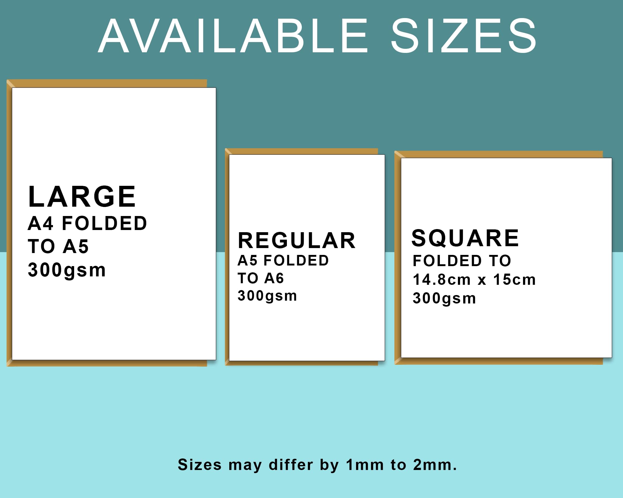 Details: Details: - 300gsm card. - Sizes - Choose between Regular (A5 folded to A6), Large (A4 folded to A5) or Square (14.9cm x 14.9cm when folded). - Envelope - Brown, kraft, recycled, included