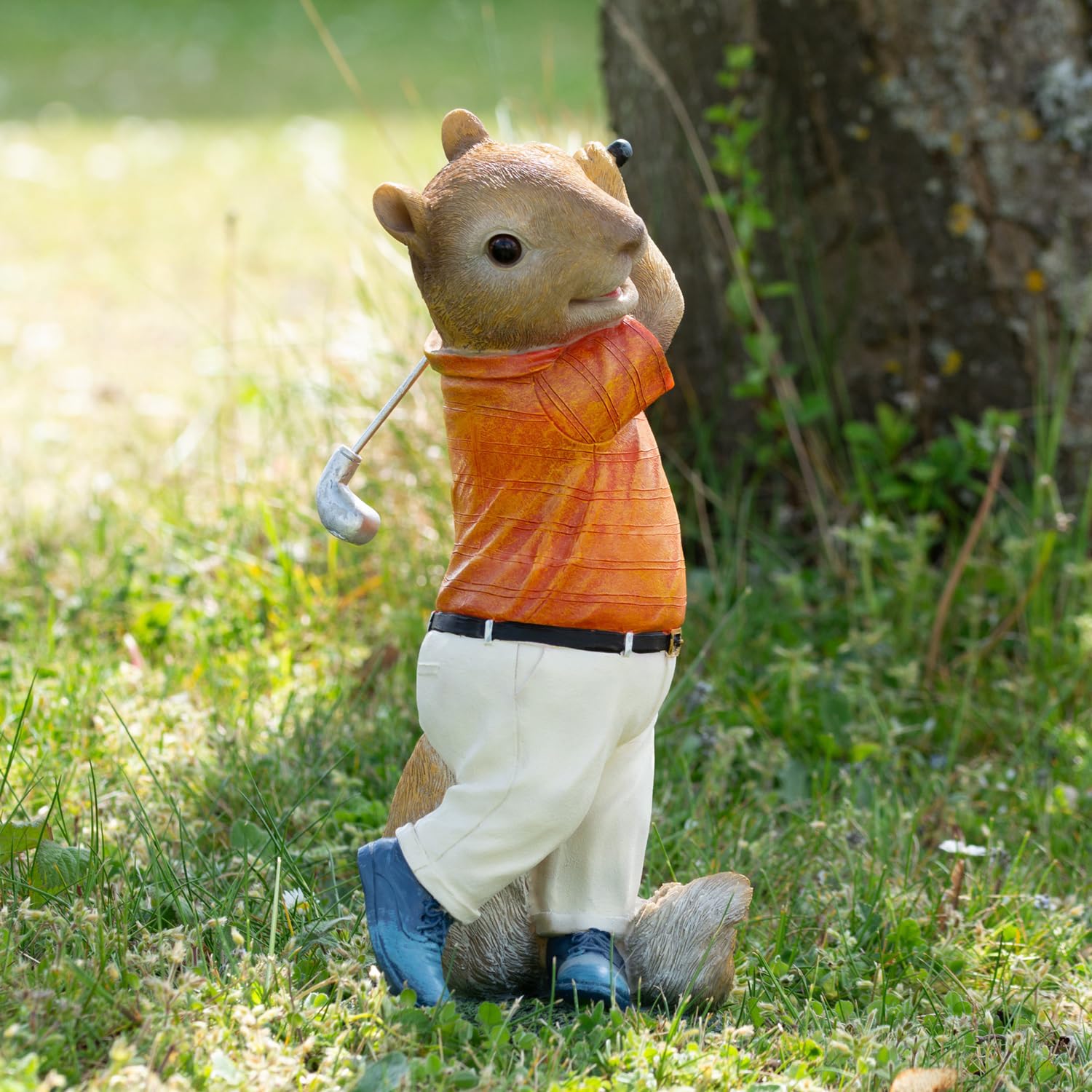 Details: Meet Darthomes very own Shaun the Squirrel golfer! Rocking an orange shirt and white trousers and blue, shoes, this novelty resin-made squirrel ornament is ready for a round on the course. It can be placed indoors and outdoors and will be a great gift idea for a golf and squirrel loving friend.