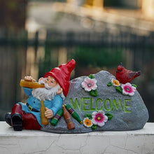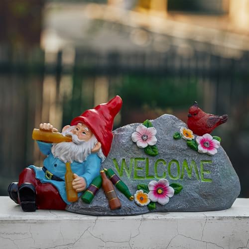 - Whimsical Gnome Design: This isn’t your average garden gnome. With two glowing beer bottles in hand, this drunk gnome lounges lazily against a rock carved with the word “WELCOME.” Around him, three more colorfully painted beer bottles and five flowers set the mood for relaxation. A friendly red bird perched near the flowers adds a playful and heartwarming touch. This gnome brings personality and warmth to your garden decor, making guests smile with its humorous spirit.
