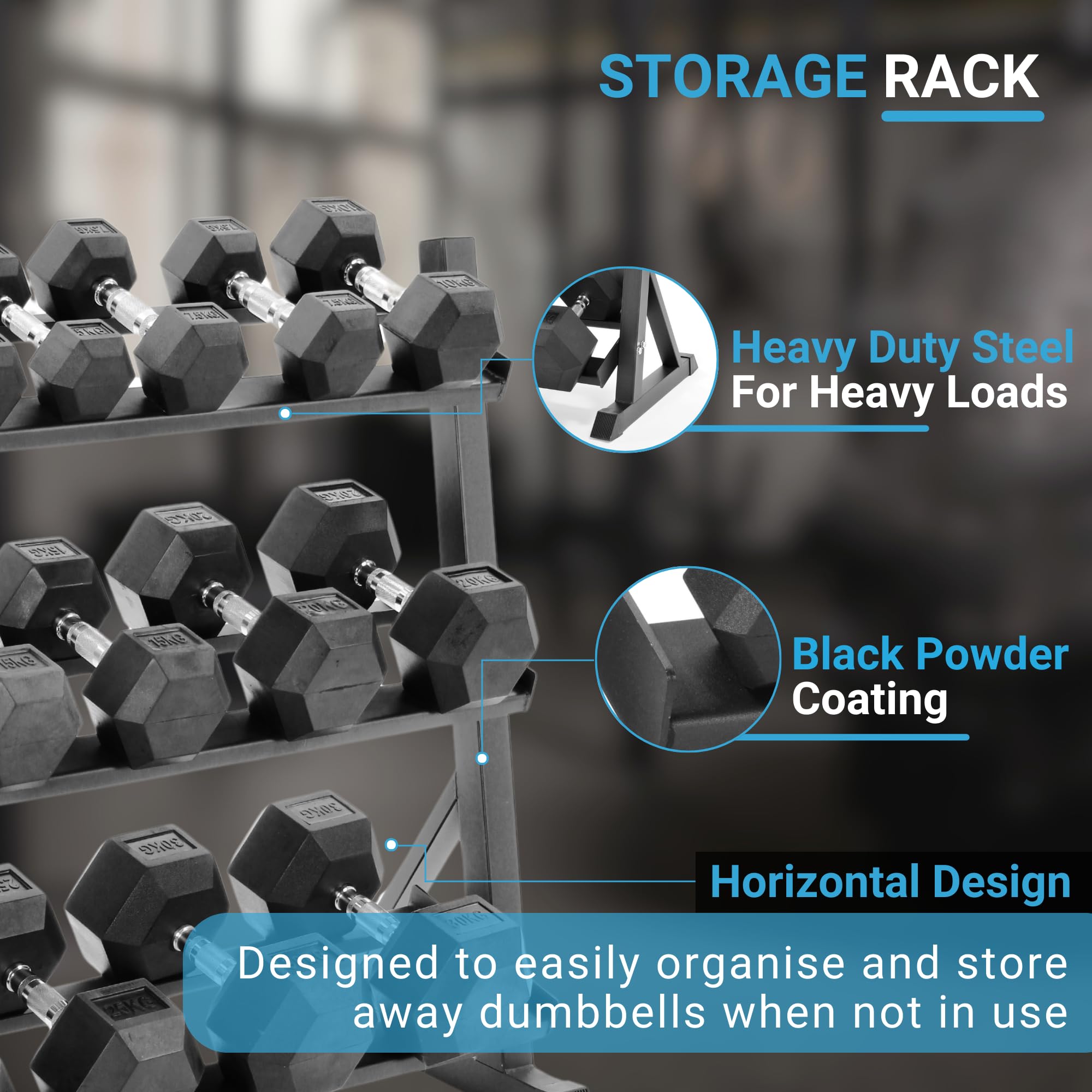 - DUMBBELLS RACK: Our full dumbell set comes with horizontal shaped storage rack making them easy to organise and store away when not in use. The dumbbell rack measures approximately 160 x 95.5 x 57.5cm (L x H x D) making it ideal strength training equipment for home use, commercial gyms, fitness classes rooms and studios