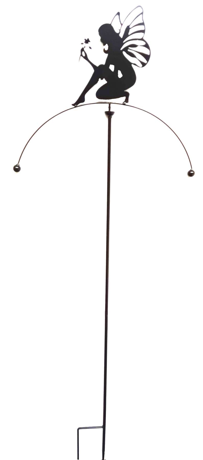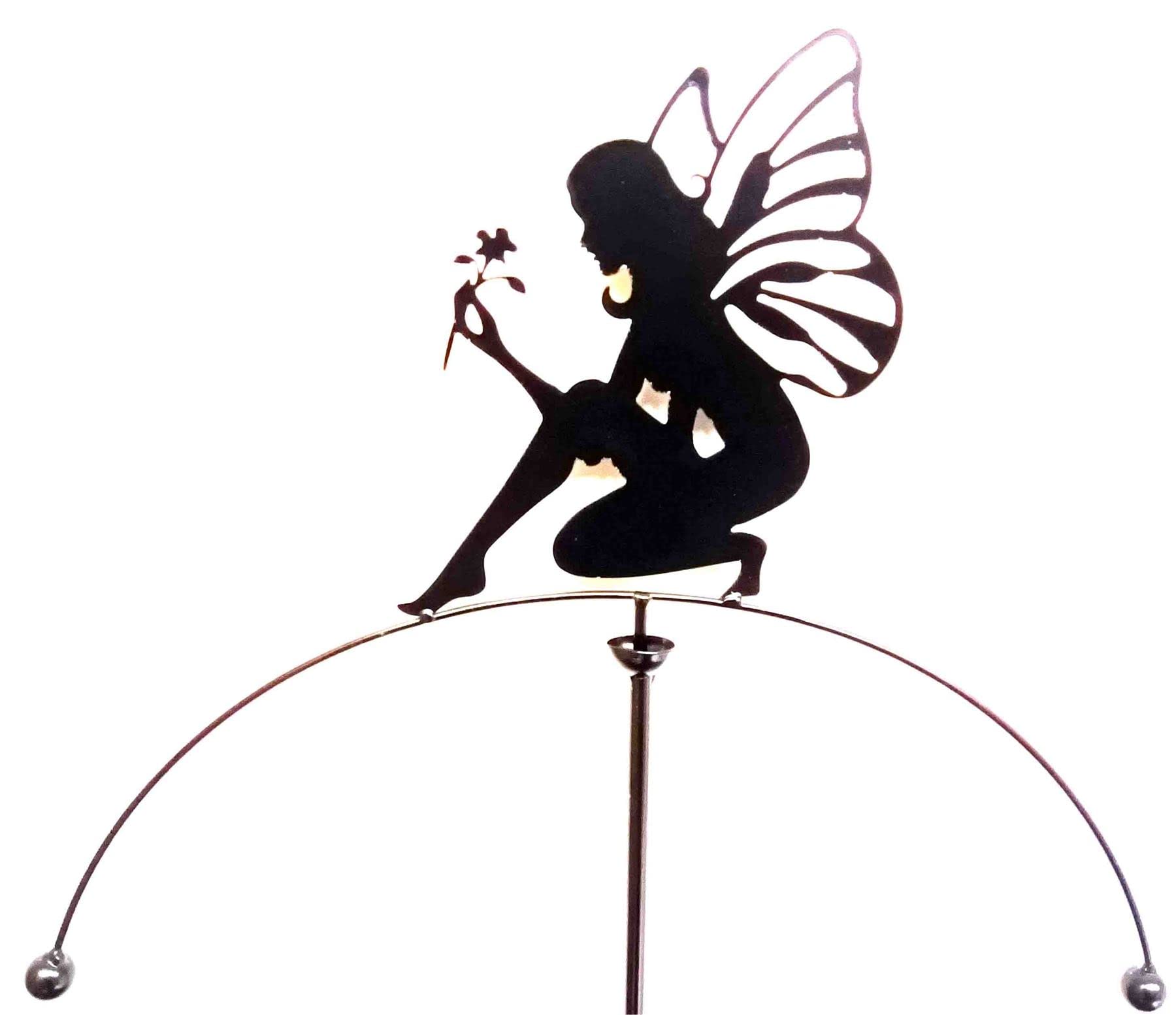 Details: Metal garden wind vane spinner rocker - Fairy design Freestanding garden stake and balance arm sculpture which rotates and rocks in the wind Laser cut fairy silhouette design Constructed from metal with painted black finish Wonderful design to add movement to the garden and a perfect gift all year round Stake comes in two pieces which easily screws together and balancing arm as one piece Measures approximately 123cm high x 44cm wide x 2.5cm deep
