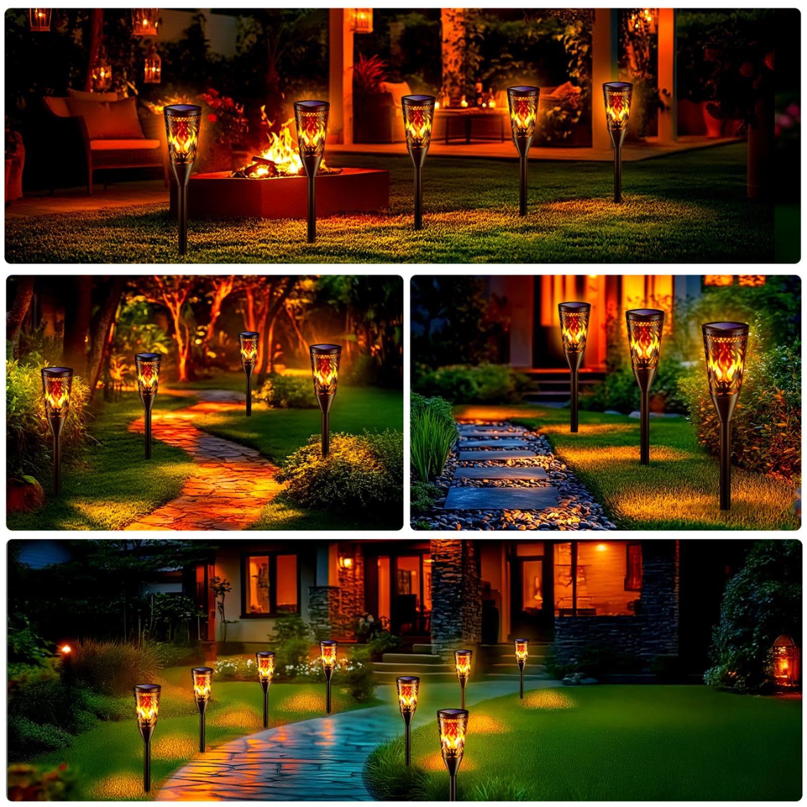 - 【2 Lighting Modes – Multiple uses】Our solar garden lights have two light modes: you can choose between steady light for cozy illumination or flashing light for a vibrant flame effect. Both modes add a unique atmosphere to your garden, path, or balcony, making them ideal for garden decoration and outside lighting.