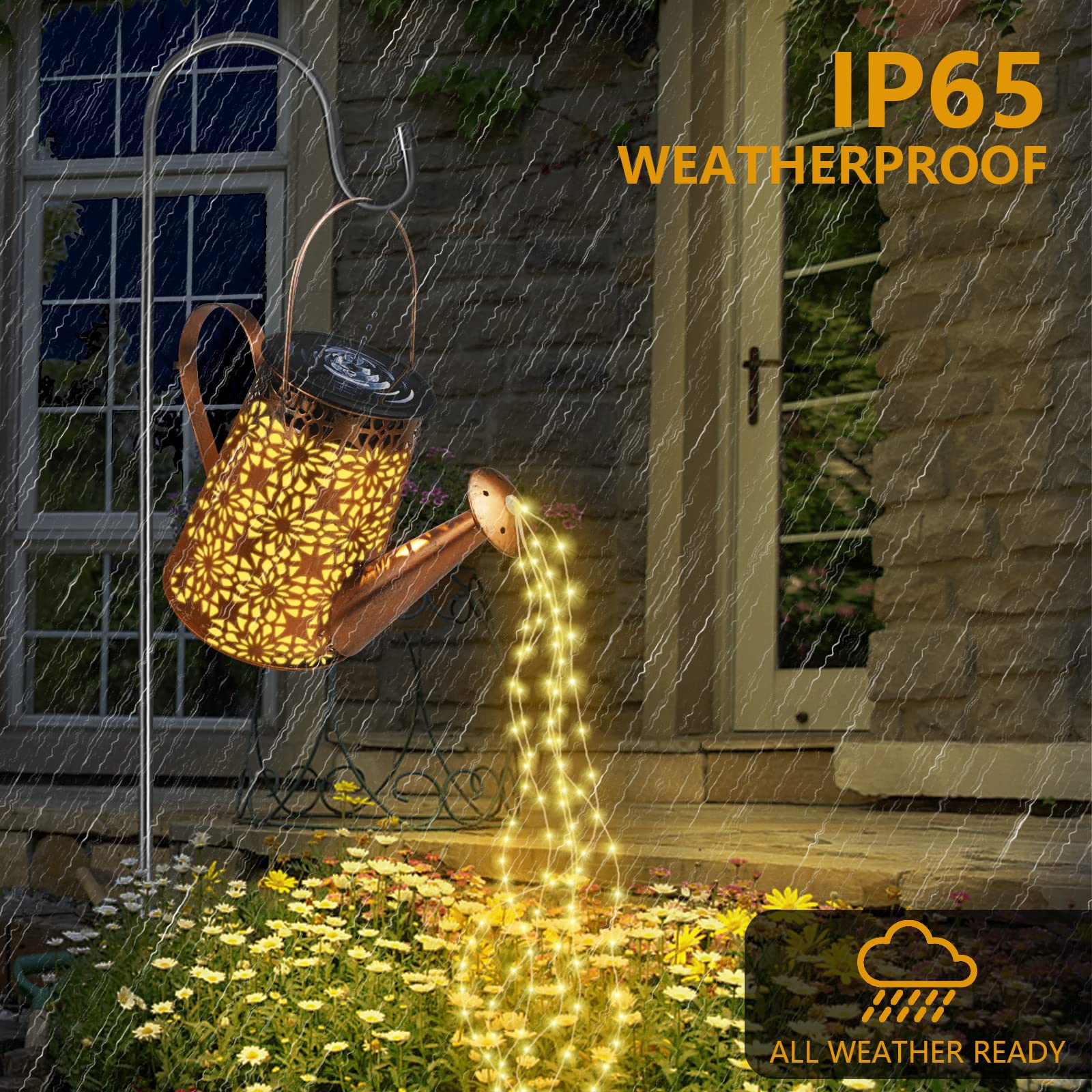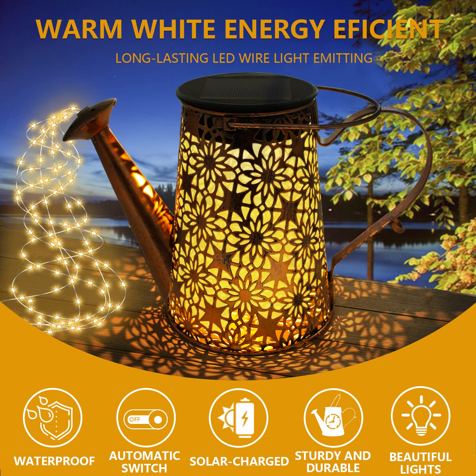 - 【Waterproof and Safety】 - The solar watering can light is made of durable metal with rustproof treatment. Solar powered watering can with light is IP65 waterproof and the electrical components are placed inside the light, which has good waterproof performance and can work normally in different weather conditions.
