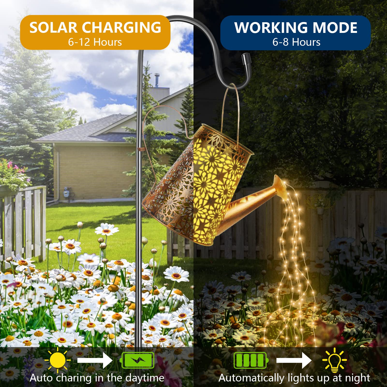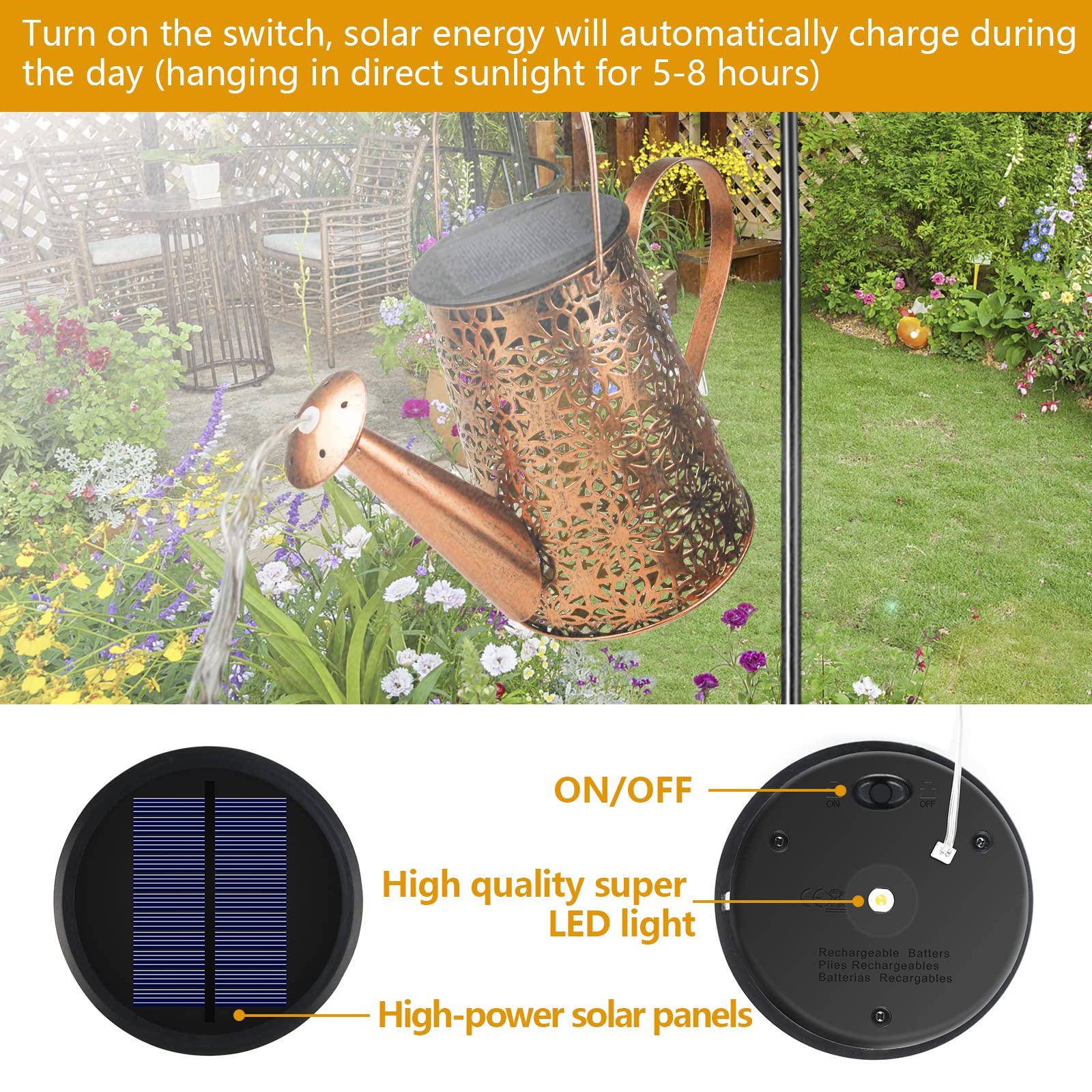 - 【Energy Saving and Auto Work】 - Our solar light watering can is 100% solar powered with solar LED panel, no extra batteries needed. It can be used for 6-12 hours after 6-8 hours of charging. The built-in light sensor ensures they automatically turn on at dusk and off at dawn.