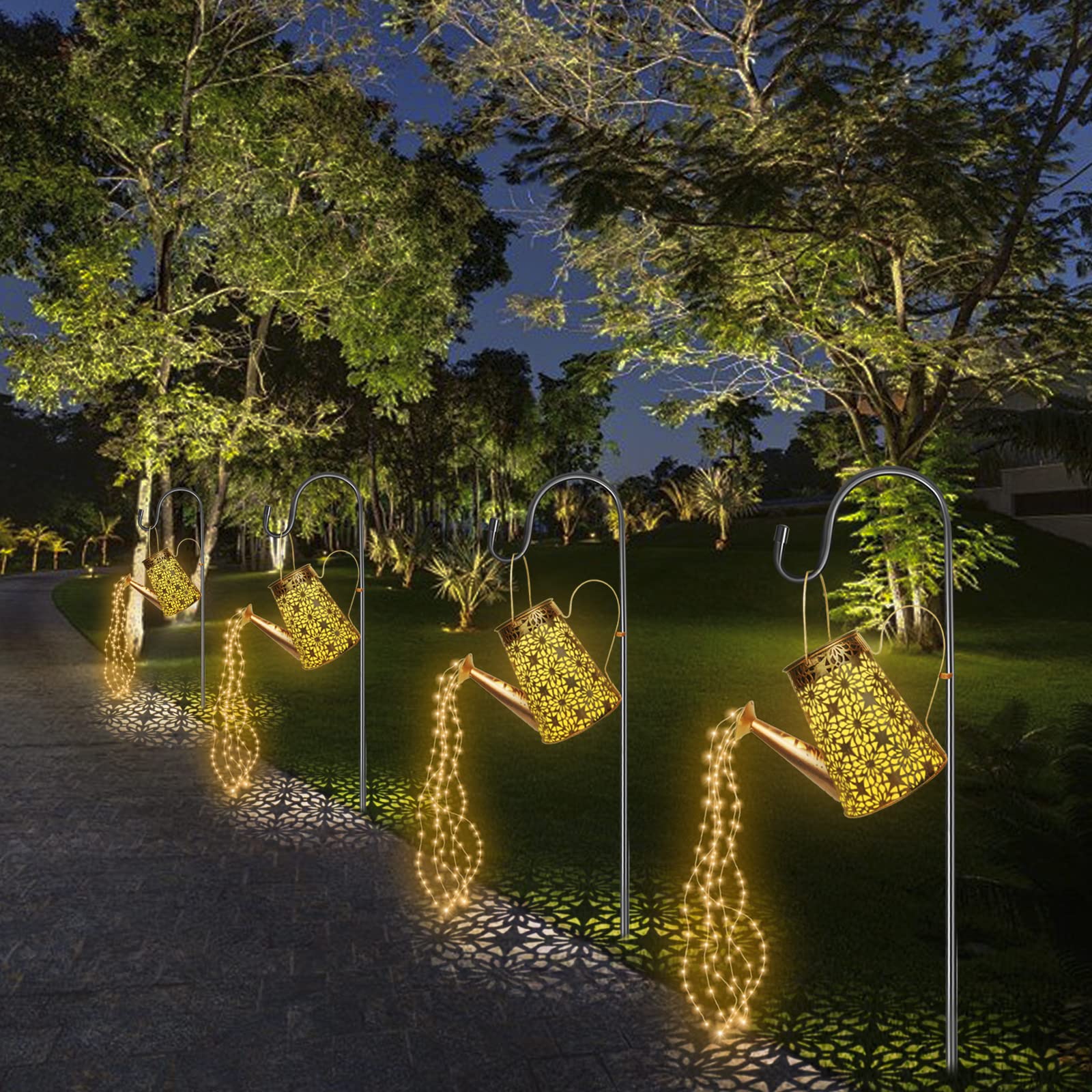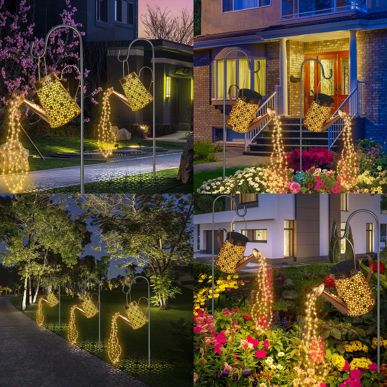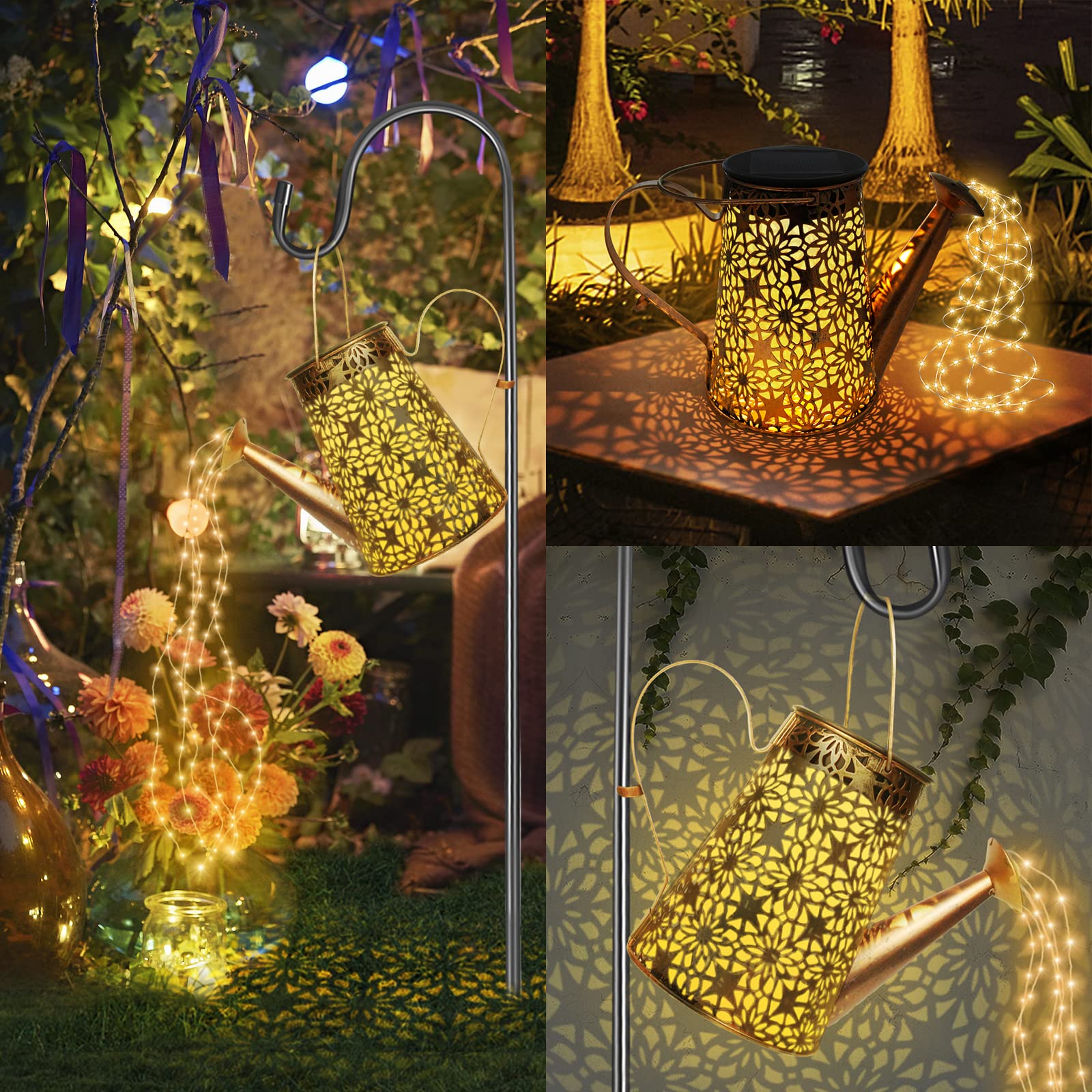 - 【Garden Solar Lights Watering Can 】- Watering can Light outdoor is with hollow copper motif and consisting of 36 LEDs with 39" shepherd's hook. The spout is exquisitely crafted with smooth edges to avoid scratches. Not easy to break.