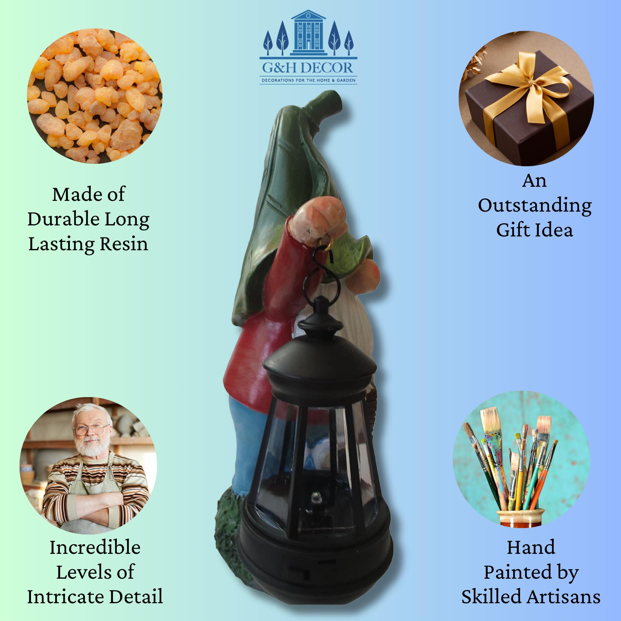 - GARDEN GNOME STATUE SOLAR LIGHT - Add a magical touch to your garden with this beautiful gnome solar light that lights up at night. Made of high-quality resin and hand-painted with UV-resistant paint, our durable solar gnomes garden statues are perfect for any outdoor space.