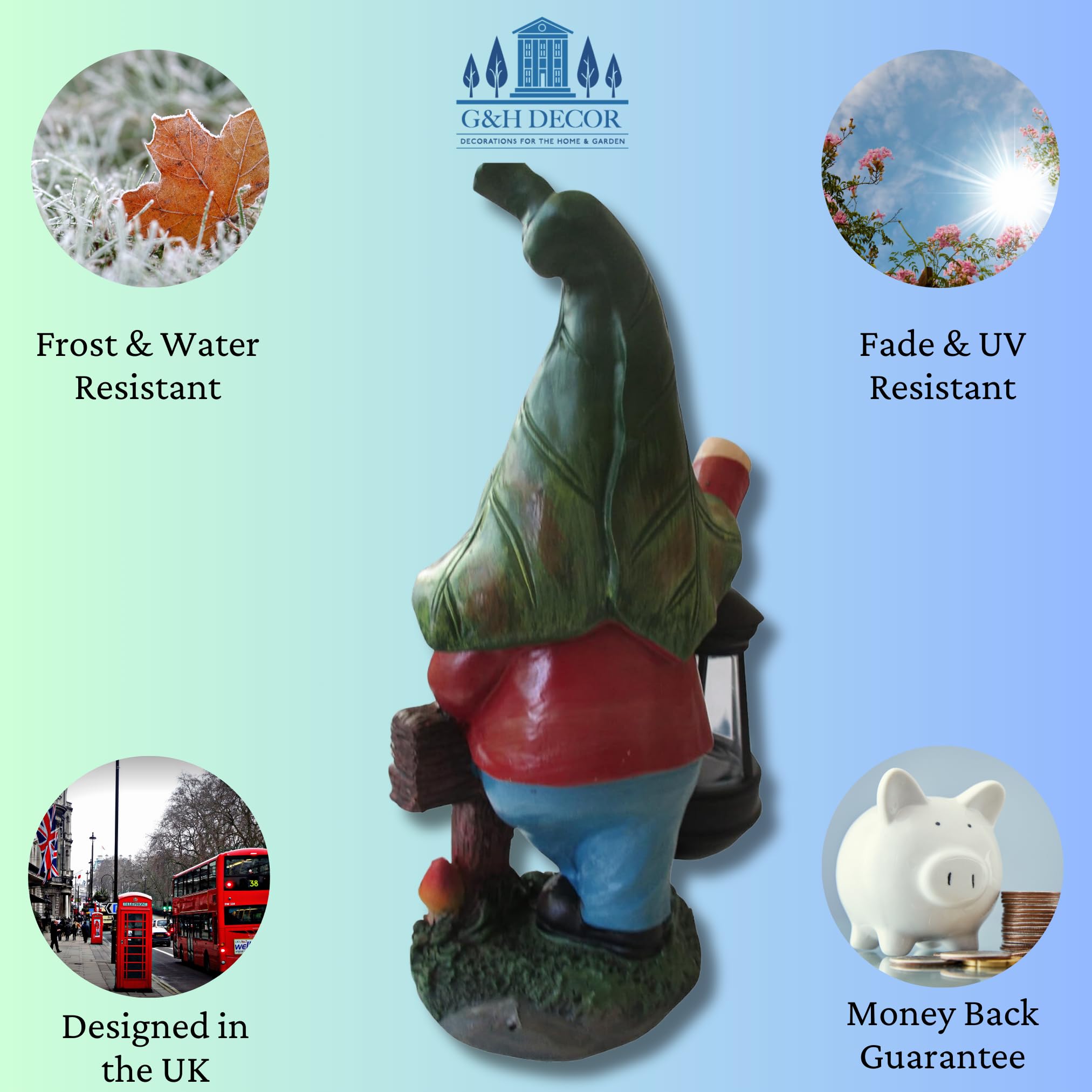 - LARGE, HAND-PAINTED SOLAR POWERED GNOME FIGURINE - Standing tall and proud, this solar garden gnome figurine is hand-painted in vibrant colors and stands out from other garden ornaments outdoor. It's also waterproof, making it perfect for any weather condition.