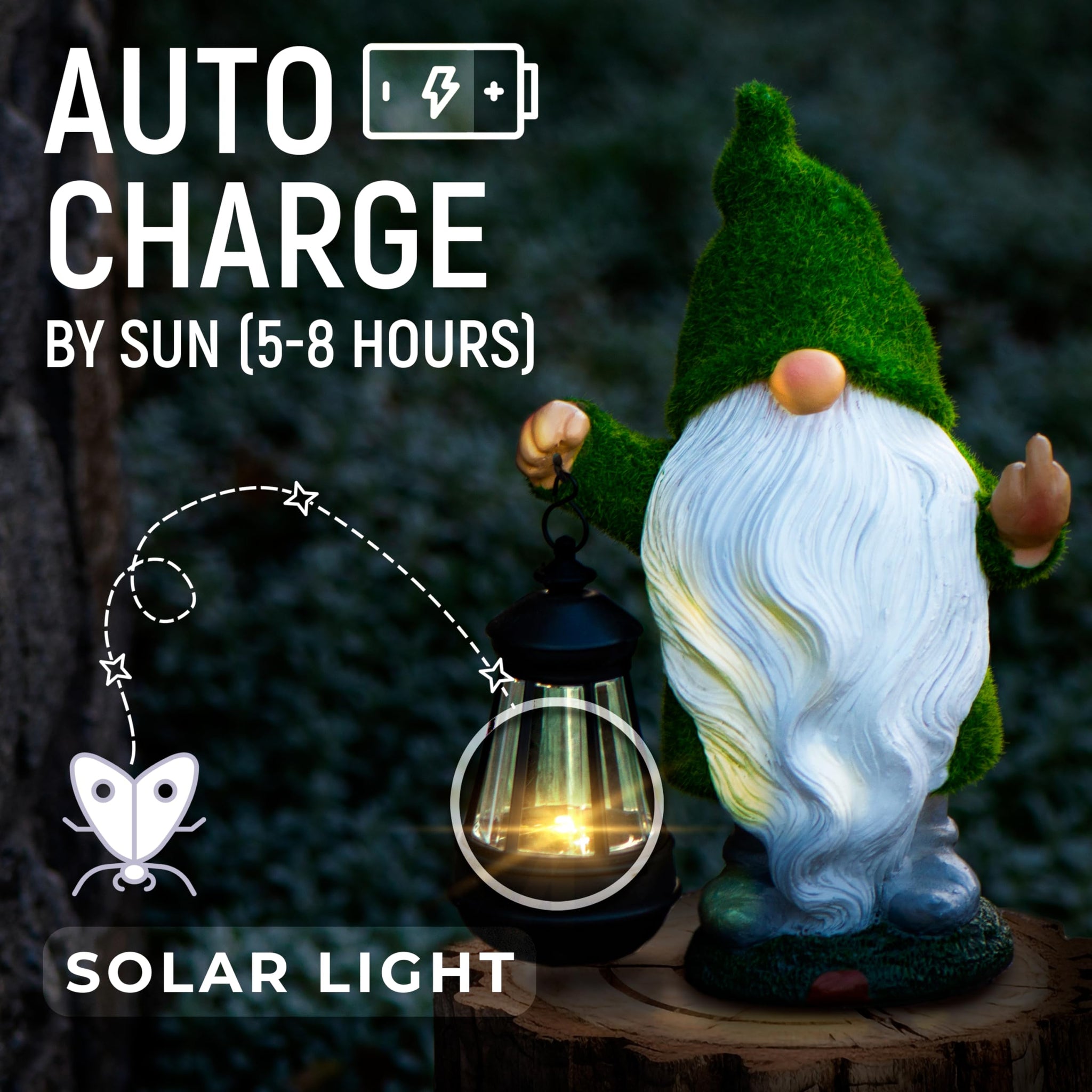 - Gnome Christmas Decorations for Solar Garden Decor: turn on the power button and leave garden gnomes outdoor funny during the day. Solar panel take 5-8 hours to fully charge and automatically light up at night.