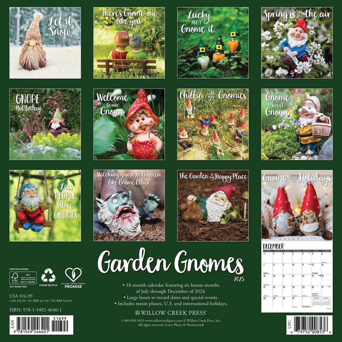 - GNOME PLACE LIKE HOME: Create a haven of gnome-inspired joy with the 2025 Garden Gnomes 12" x 12" Wall Calendar. Each month, this charming calendar unveils a new scene featuring mischievous beings in pointy hats, adding a touch of folklore to your wall. Whether nestled among flowers, perched on toadstools, or hidden in greenery, the spirit of garden gnomes will infuse your space with prosperity and harmony in the new year.