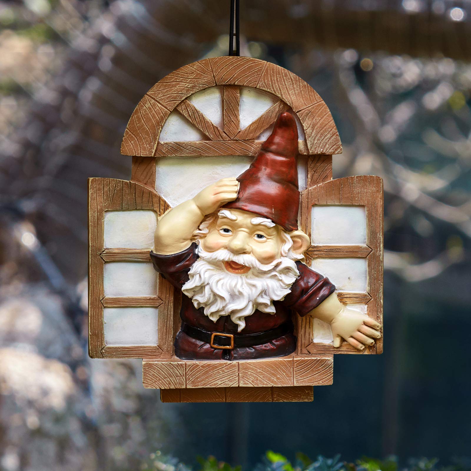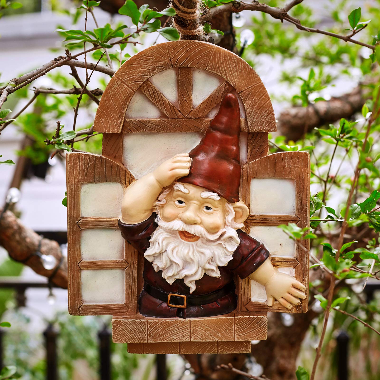 - A surprise tree hugger for your garden, make a special window for the elf come from the world of magic. The delicate funny gnome statue who hunts for fairies outside his window and tips his gnome hat to welcome visitors. Size: 9.06"w x 2.48"d x 12.2"h Inch.