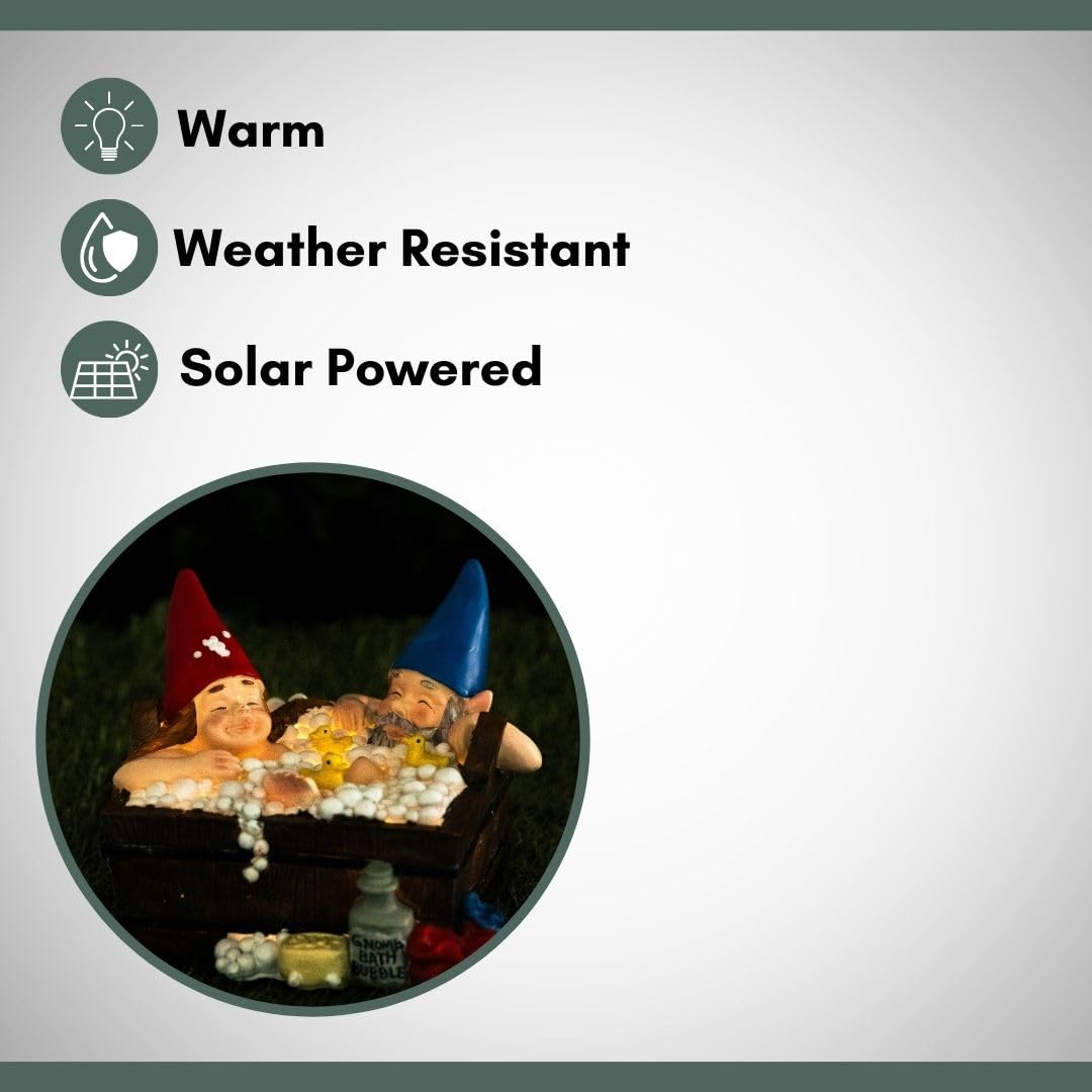 - Add a little fun and humor to your garden decor with our gnome couple enjoying a bubble bath. This beautiful gnome figurine is a great way to bring some humour to your space. Crafted from polyresin, these fun gnomes are hand-painted with bold, bright colors that will look amazing in your garden.