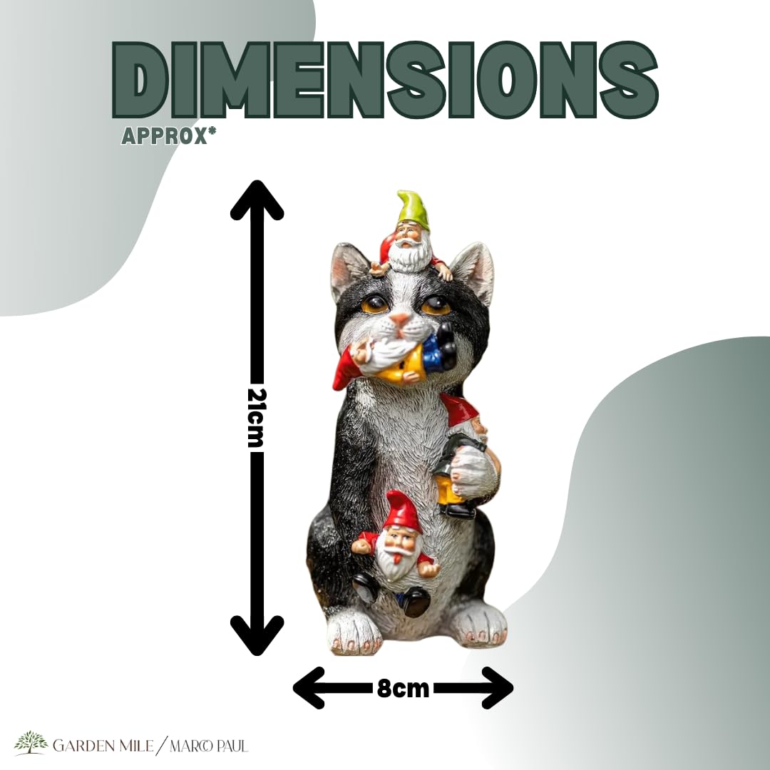 - Cat Garden Ornament - Measuring Approximately 21cm X 8cm X 9cm, This Unique Garden Decoration Features A Black And White Cat With 4 Unfortunate Multi Coloured Gnomes All Over. Crafted From Resin, This Can Be Displayed Both Outdoors And Indoors.