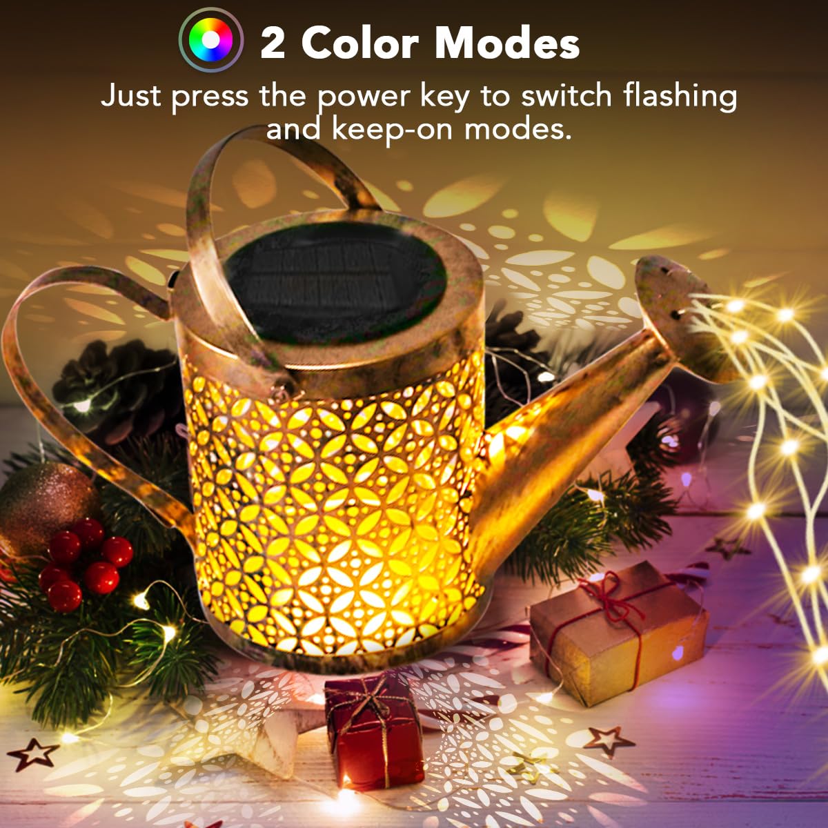 - 【Dual Light Mode】The solar fairy lights have always on and flashing modes, just press the key again to switch the light mode. Made of high-quality thick iron sheet adopting dustproof and rustproof treatment, gorgeous bronze paint on the outside prevents rust. Solar water can lights is IP65 waterproof rating, perfect for outdoor use, even in bad weather such as rain, snow, frost or sleet, you don't worry about the watering can art light being short-circuited by the weather.