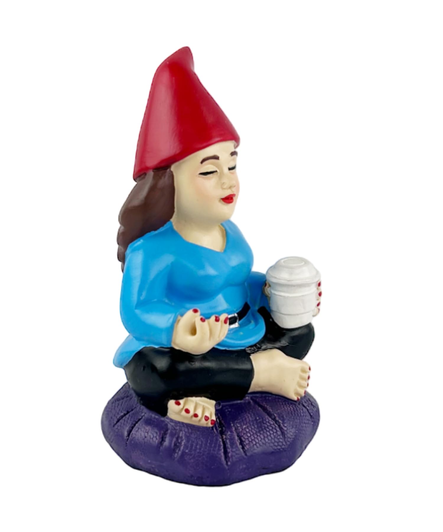 - FUNNY GNOME MINIATURE: our tiny Lady Double Bird Gnome has traded in flipping her middle finger for drinking coffee and yoga. She's decided to seek quiet meditation and calmly sits on her pillow. Our favorite naughty girl gnome has accepted serenity now., who knows maybe she'll adopt a cat or dog and make friends with the garden fairies.