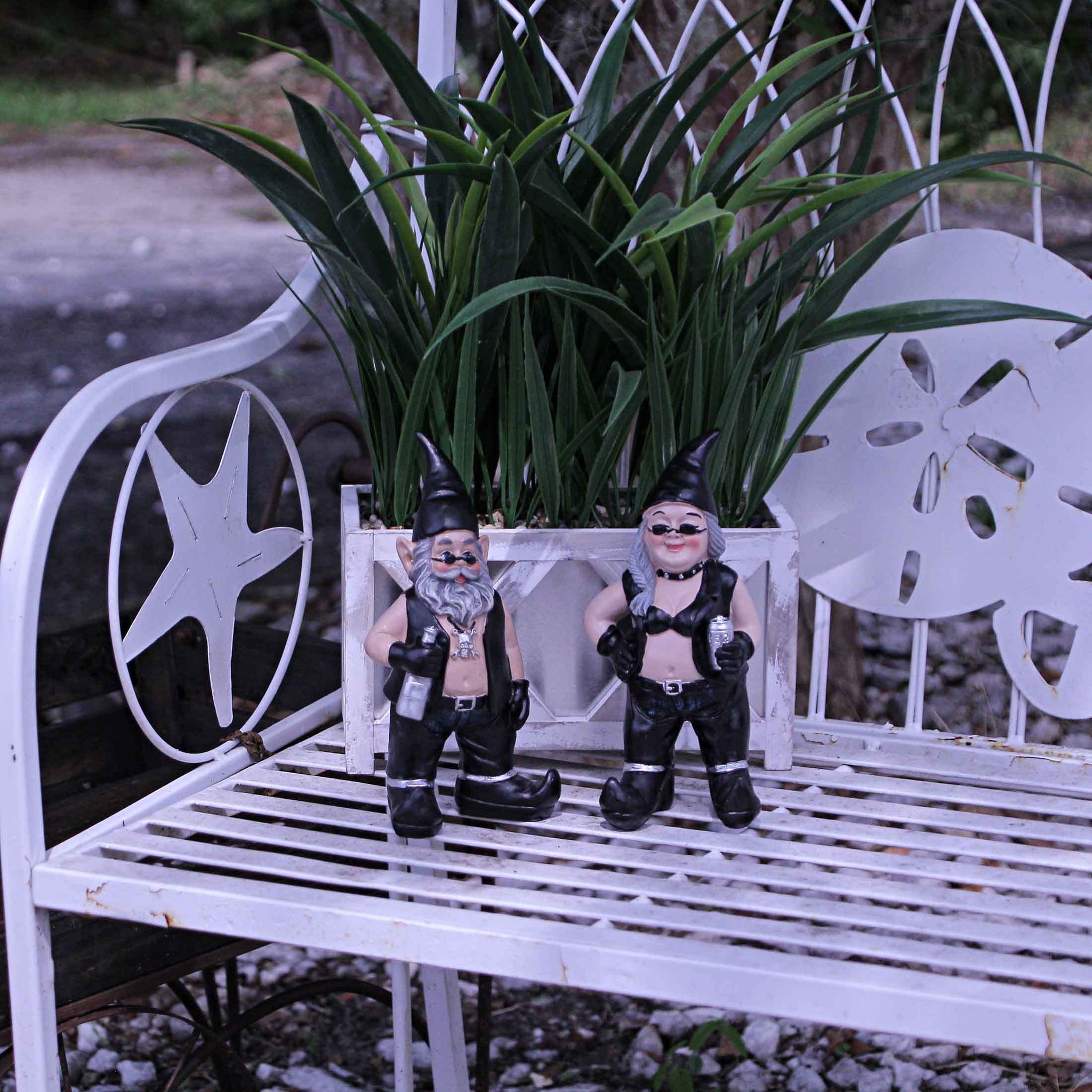 Details: Description OVERALL SIZE - Each Measures 7.5 Inches High, 3.5 Inches Long, 2.5 Inches Wide. CREATIVELY CRAFTED - Cast in Durable and Weather Resistant Resin Material. READY to RIDE - Gnoschitt and Gnofun Wear Hand Painted Black Biker Outfits with Characteristic Gnome Details Like Their Pointy Hats and Oversize Boots. STANDOUT PAIR - An Unconventional Couple of Gnomes that Will Raise a Lively Reaction Anywhere. UNIQUE DECOR - An Exclusive Biker Gnome Design You Won't Find Anywhere Else. Gnoschitt and his wife, Gnofun, are done dealing with the normal gnome life of gardening, fishing, and chopping wood, so now they`re hell-bent for leather! Fresh off the hog, Gnoschitt and Gnofun are happy to be standing with an ice-cold adult beverage in hand. Gnoschitt wears his grey beard full, a leather vest, leather chaps and jeans, a bold skull and crossed wrenches necklace and curved-toe boots. Gnofun wears a studded choker, a halter top under a leather vest, leather chaps and jeans, and curved-toe boots. The perfect pair, Gnoschitt and Gnofun measure 7.5 inches tall, 3.5 inches long, 2.5 inches wide, and are expertly cast in weather-resistant resin in an exclusive design you won't find anywhere else. Gnoschitt and Gnofun are bad to the bone and will bring their best biker fun to your garden, lawn, or home. Great for indoor or outdoor display, they look just as good on a bookshelf as they do in your flower beds. They are large enough to catch your attention and small enough to not get in your way. OVERALL SIZE - Each Measures 7.5 Inches High, 3.5 Inches Long, 2.5 Inches Wide. CREATIVELY CRAFTED - Cast in Durable and Weather Resistant Resin Material. READY to RIDE - Gnoschitt and Gnofun Wear Hand Painted Black Biker Outfits with Characteristic Gnome Details Like Their Pointy Hats and Oversize Boots. STANDOUT PAIR - An Unconventional Couple of Gnomes that Will Raise a Lively Reaction Anywhere. UNIQUE DECOR - An Exclusive Biker Gnome Design You Won't Find Anywhere Else. Gnoschitt and his wife, Gnofun, are done dealing with the normal gnome life of gardening, fishing, and chopping wood, so now they`re hell-bent for leather! Fresh off the hog, Gnoschitt and Gnofun are happy to be standing with an ice-cold adult beverage in hand. Gnoschitt wears his grey beard full, a leather vest, leather chaps and jeans, a bold skull and crossed wrenches necklace and curved-toe boots. Gnofun wears a studded choker, a halter top under a leather vest, leather chaps and jeans, and curved-toe boots. The perfect pair, Gnoschitt and Gnofun measure 7.5 inches tall, 3.5 inches long, 2.5 inches wide, and are expertly cast in weather-resistant resin in an exclusive design you won't find anywhere else. Gnoschitt and Gnofun are bad to the bone and will bring their best biker fun to your garden, lawn, or home. Great for indoor or outdoor display, they look just as good on a bookshelf as they do in your flower beds. They are large enough to catch your attention and small enough to not get in your way. Additional Details SKU: ZKO-99260 UPC: 810045992600 Condition: New Product Dimensions: 7.5 x 3.5 x 2.5 Inch Material: Resin