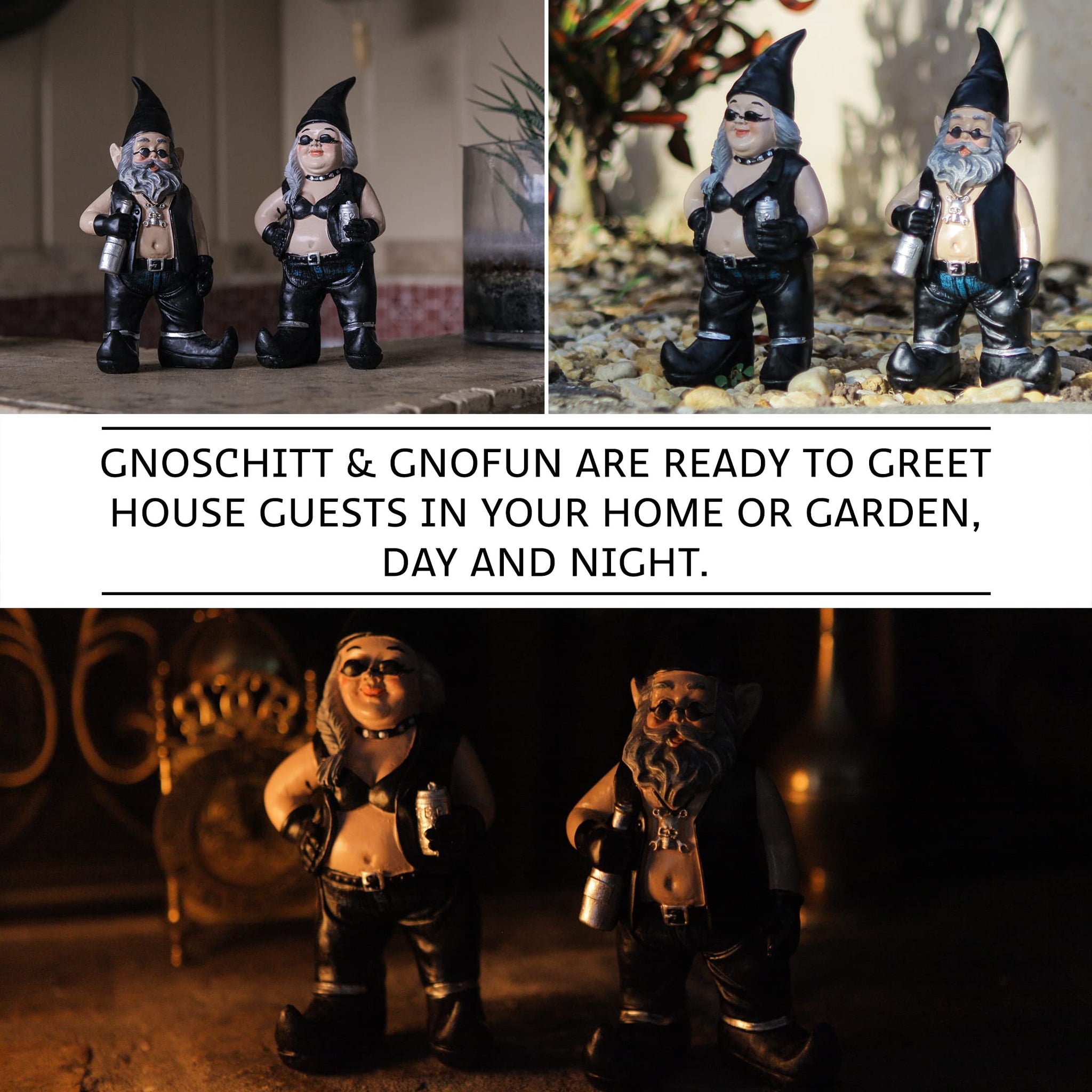 - Biker Chic - Gnoschitt and Gnofun are dressed to impress in hand-painted black biker ensembles, featuring classic gnome elements like pointy hats and oversized boots, adding a touch of whimsy to their rebellious style.