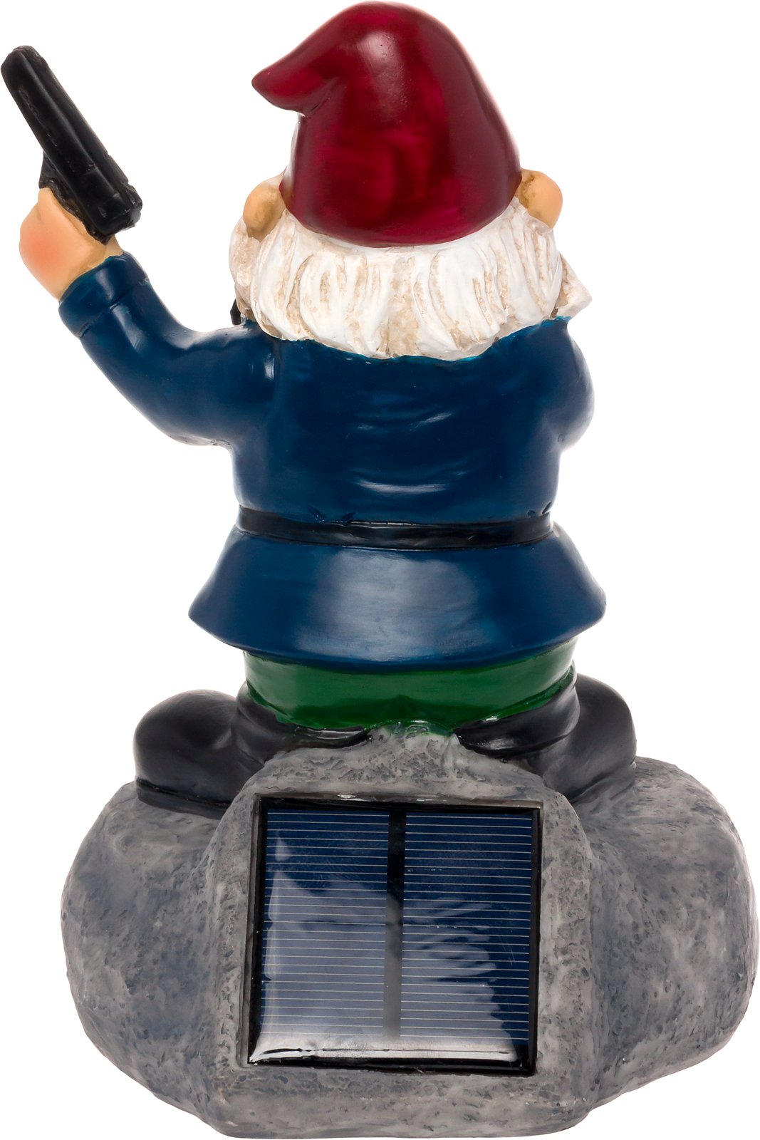 Details: Watch out - this gnome is armed and dangerous! Protect your yard with this Solar Powered 2nd Amendment Garden Gnome by GreenLighting. Crafted from a durable poly-resin, this locked and loaded lawn ornament stands proudly, guns in the air. The 2V crystalline solar panel charges the 1.2V NI-MH 600mAh AA rechargeable battery, powering the light inside without extra cords or plugs. At night, this pistol wielding gnome lights up, thanks to the energy absorbed during the day, and casts a 5 lumen glow, ideal for pathways and planters alike. Great as a unique gift, or just a fun way to spruce up a flower bed, this Light-Up Second Amendment Gnome Statue will be a great conversation starter. Measures 4.6" x 4.6" x 7.8".