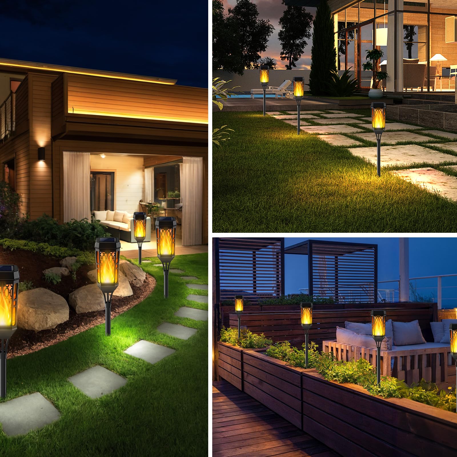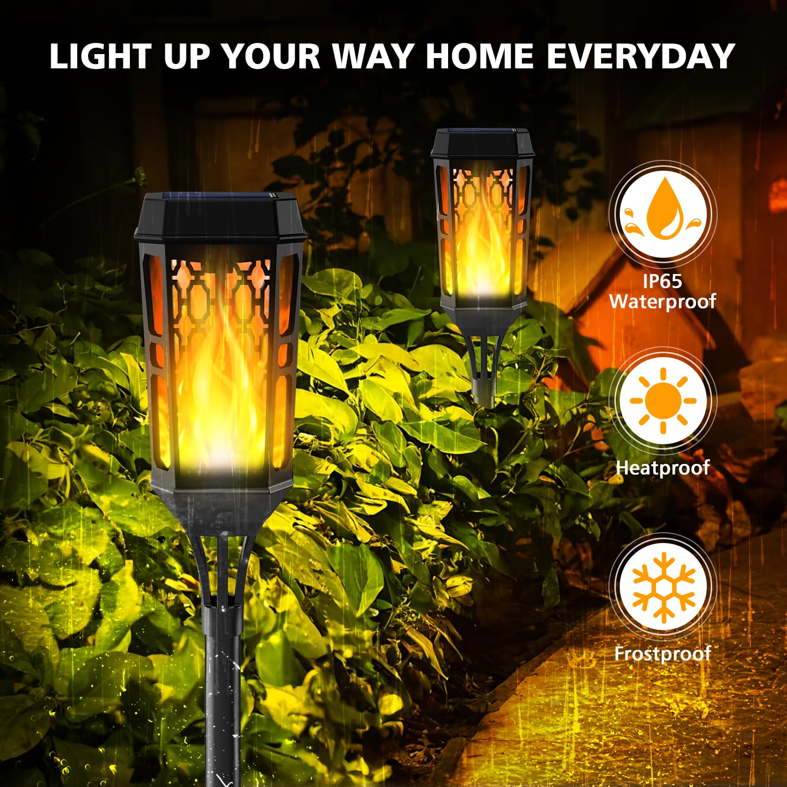 - 🏡【Multiple Scene Applications】Our flickering flame solar lights are perfect for home, garden, patio, walkway, walkway landscaping decoration and garden party, camping, barbecue, wedding, Christmas, Halloween festival, providing the perfect campfire atmosphere. No wiring required, just install the solar flashlight anywhere you like and enjoy a truly safe "fire"!