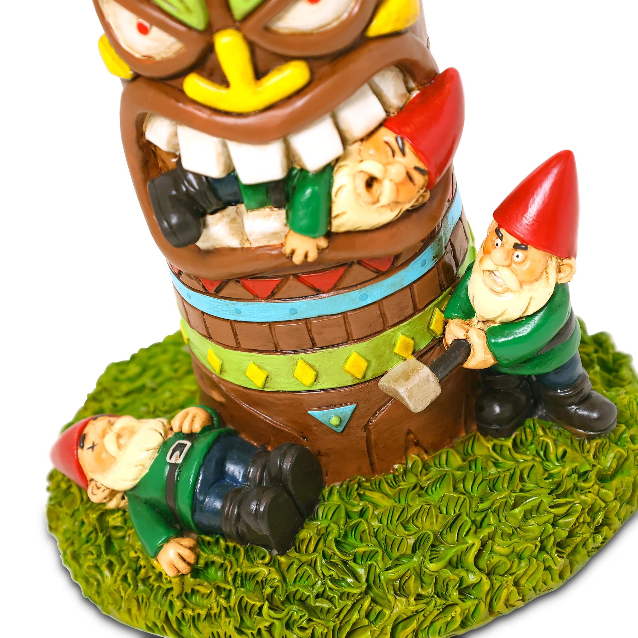 Details: Now here's a fresh take on the boring, traditional garden statue we all know, and an instant comedic upgrade to your property! This is a scene from the legendary tiki tragedy—look closer and you'll notice a hilariously chaotic battle between the wood-chopping gnomes and an innocent tiki totem. It only took a few swings for everything to descend into a downward spiral for the pack of gnomes, awakening the tiki totem in the worst possible way. This garden statue is made of durable, cast resin to outlast the elements all year round and stands over 9 inches tall, making it a delightful addition to your yard, indoors or out! KwirkWorks gnomes are an internet sensation because of their attention to detail. Each is a 360 degree experience, filled with charming details from head to toe, front to back. Spin them around and you'll see amazing textures and hand-painted workmanship all over—they're a visual treat for your home's visitors that never disappoint when discovered. KwirkWorks gnomes are made to last, and can be left out all year long. These gnomes are just as hard-working as their legendary reputations and never complain about heat, sun, drought, snow, ice, rain, or even the neighborhood stray dog.