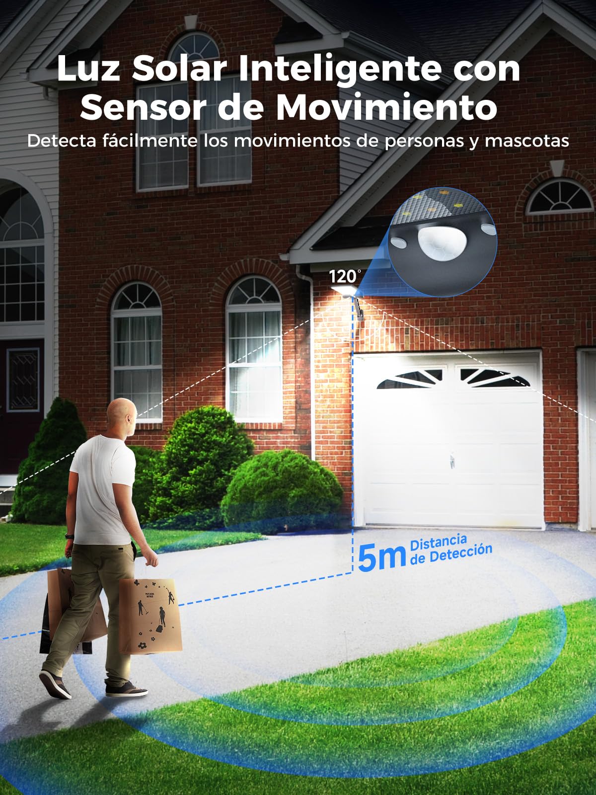 - 3 lighting modes to choose from: It offers 3 lighting modes: 1 motion sensor + dim light mode: the lamp turns on at night with 100% brightness when motion is detected, after 15 seconds the light is dimmed. Motion sensor mode: the lamp turns on at night with 100% brightness when motion is detected, turns off after 15 seconds ③CONSTENT ON Mode mode: The lamp lamp is switched automatically turns on at night. The motion sensor of the LED solar light can detect a range of 1-5 metres