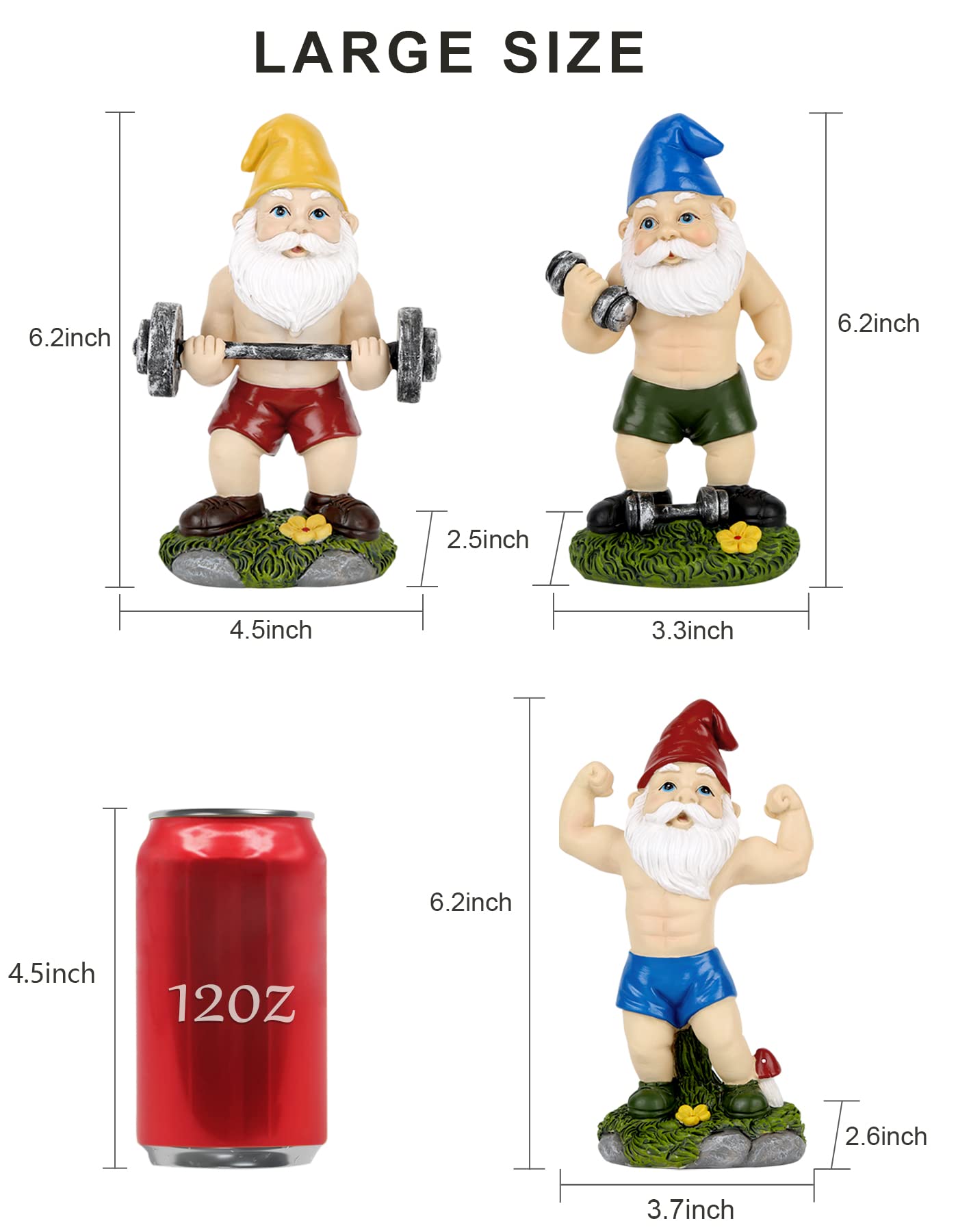 Details: MRSIVROP 3PCS fitness gnomes statues (Dumbbell gnome:6.2*3.3*2.5 inch; Barbell gnome:6.2*4.5*2.5in; Muscular gnome:6.2*3.7*2.6 inch)