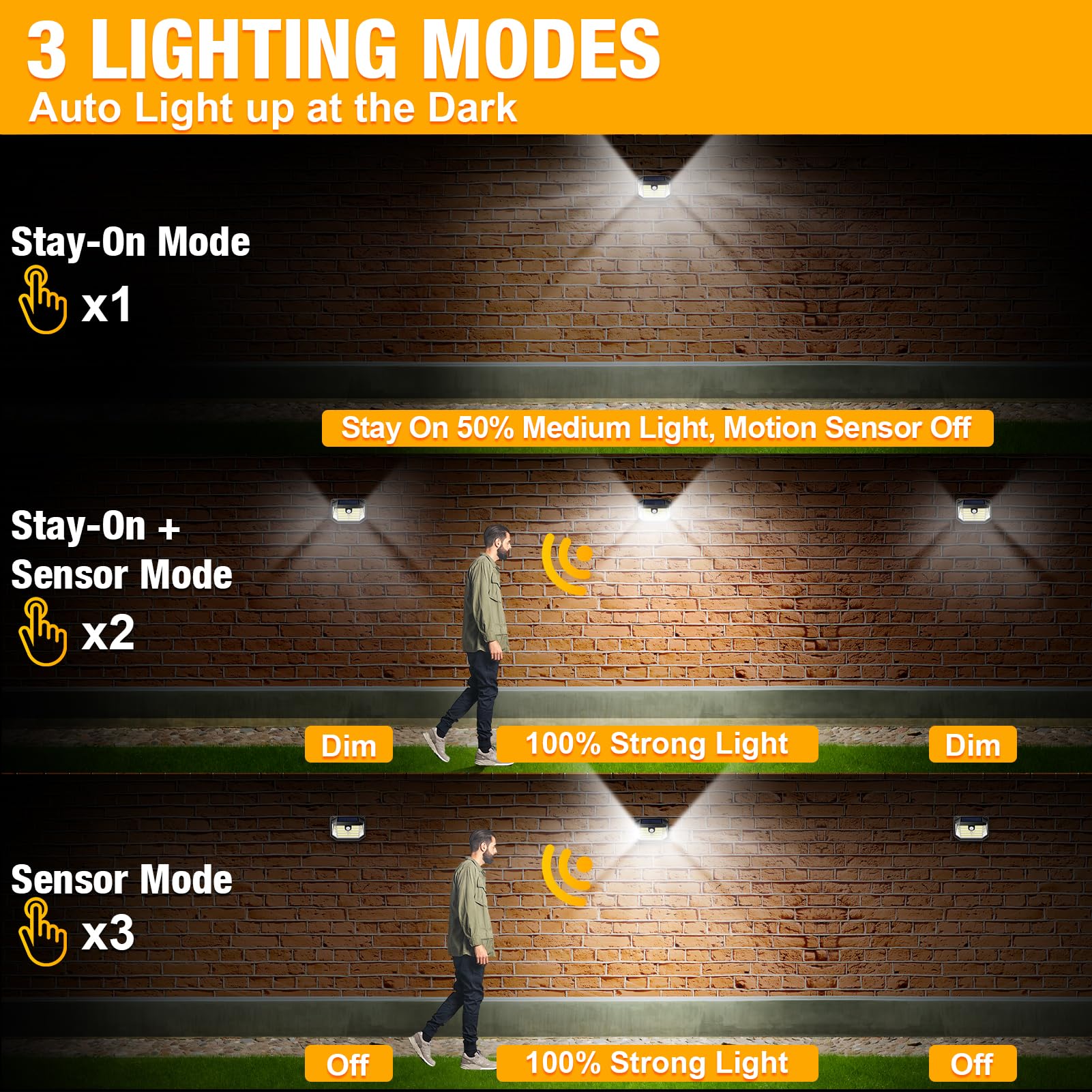 - [Intelligent Motion Sensor]- Customize your outdoor lighting with our smart motion sensor solar security lights. Choose from constant 50% brightness, motion-activated bright light with a 20-second dim transition, or full 100% brightness that turns off automatically after 20 seconds, catering to your preferred level of convenience and security.