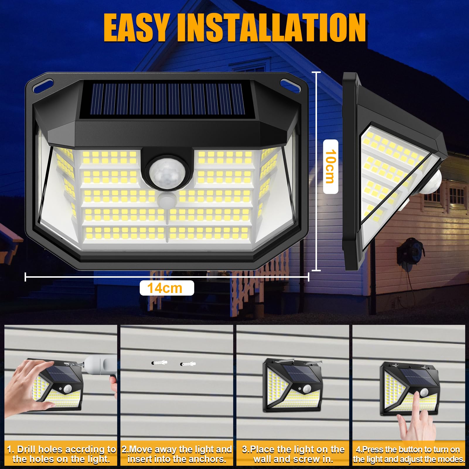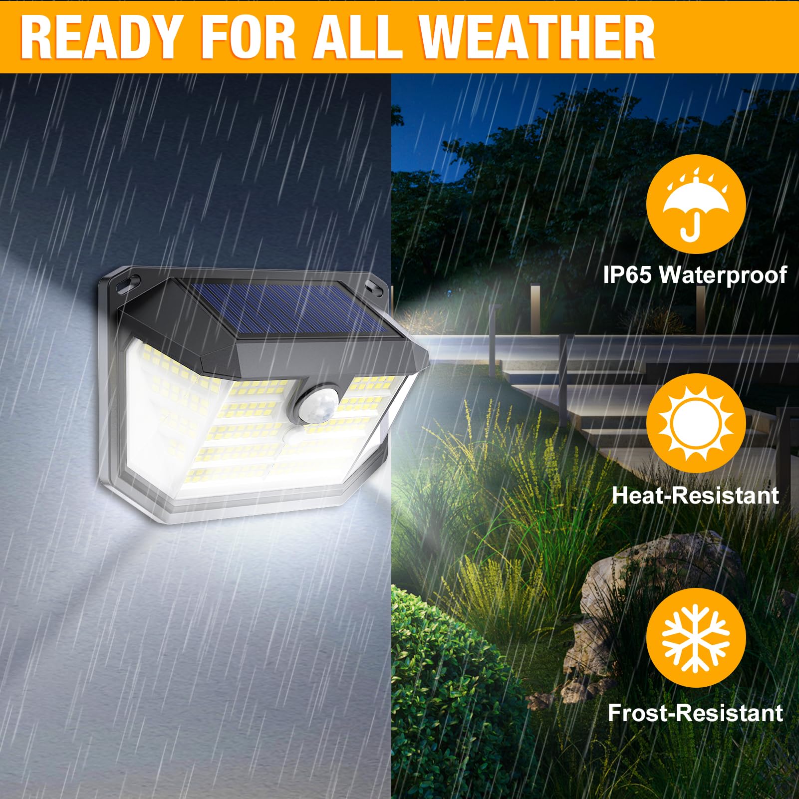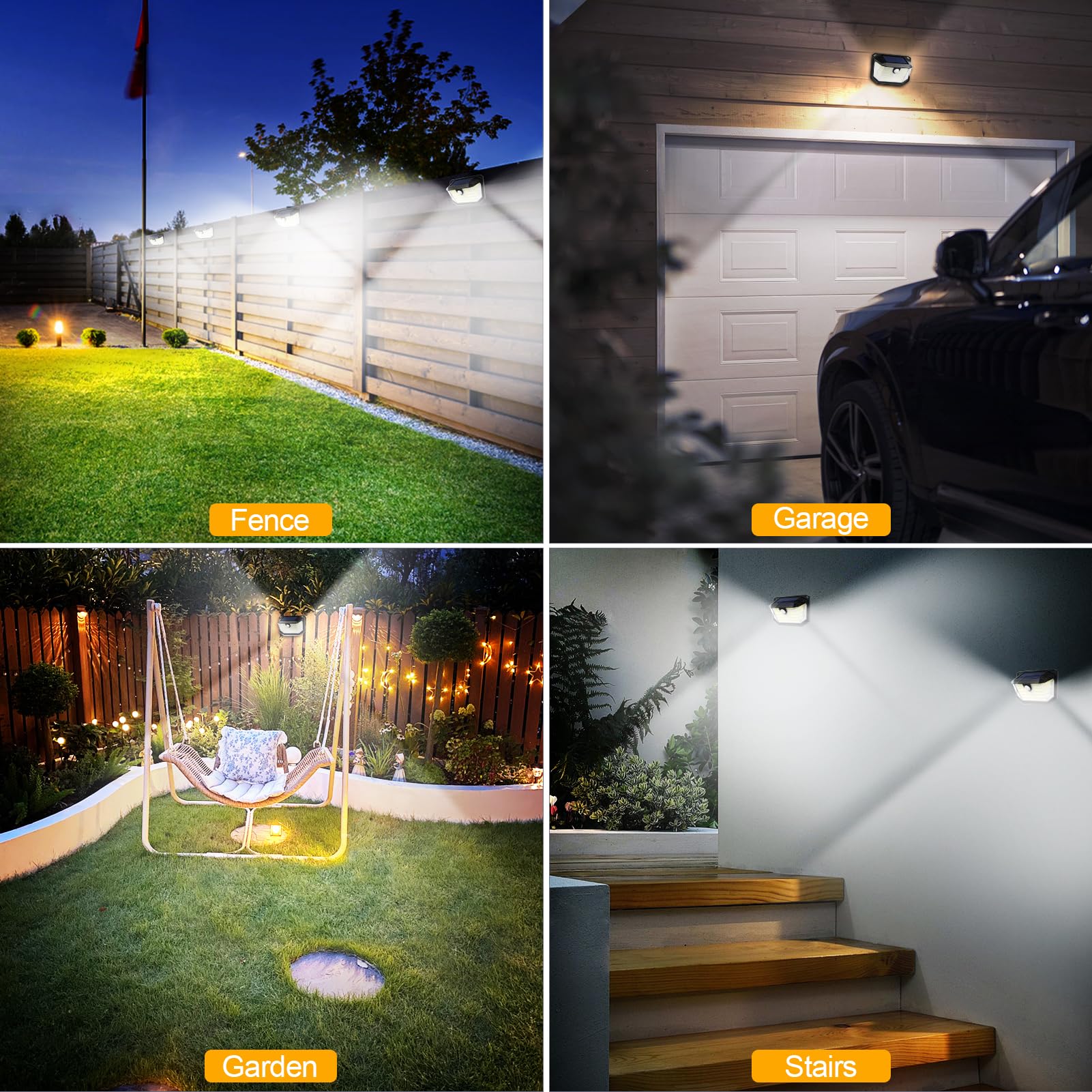 - [Ultra-Wide Angle Illumination]- Our outdoor solar lights feature 230 high-performance LEDs and a 270° wide-angle beam, delivering broad and brilliant illumination for your garden, wall, fence, front door, garage, shed, driveway and stairway. This design ensures comprehensive coverage, creating a well-lit and secure environment for your outdoor spaces.