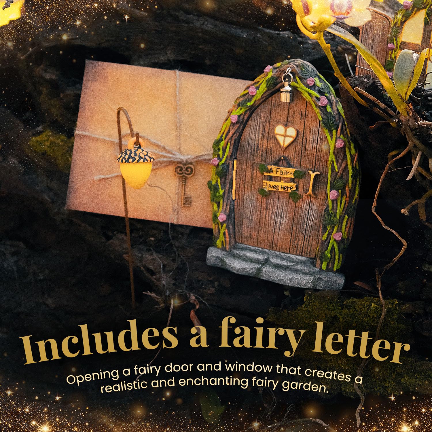 - Glows in the Dark: This fairy door is beautifully hand painted and sculpted with realistic details and a natural woodland look, with climbing vines, roses and A Fairy Lives Here sign; It includes a fairy door that opens and has a light, also one glow in the dark window and a little bird house which will collect sunlight during the day to give your garden a whimsical look at night; It looks absolutely magical nestled at the base of a tree or hidden in the bushes for the little ones to find