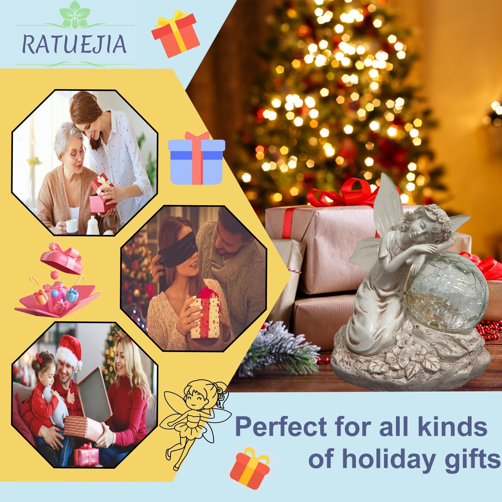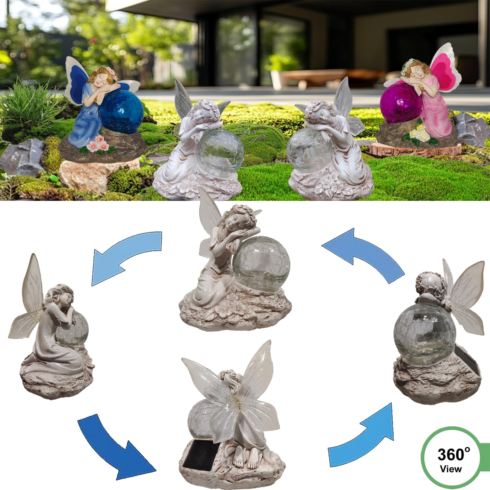 - 【Solar Fairy Statue】This garden decoration is uniquely designed, the fairy is holding a magical cracked glass ball, the wings and the glass ball will emit colorful colors at night, bringing a charming glow to your outdoor space.