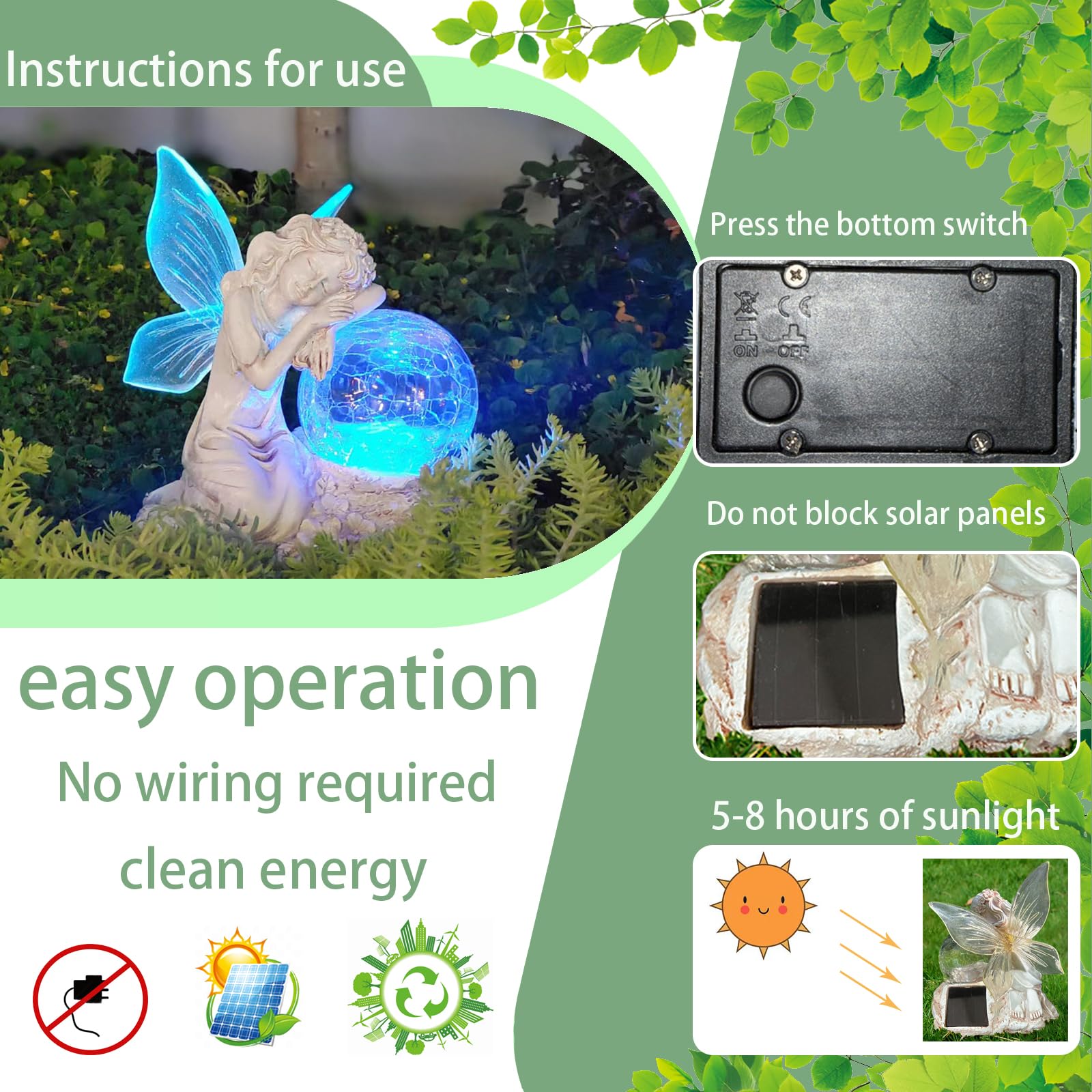- 【Easy to Use】Place the button in the "on" position. Solar powered angel statue recharges for 5-8 hours during the day and illuminates for 8-10 hours at night. Automatically turns on at dusk and off at dawn. No wiring required. Super easy to use. Our outdoor decorative figurines are sure to be a charming sight!