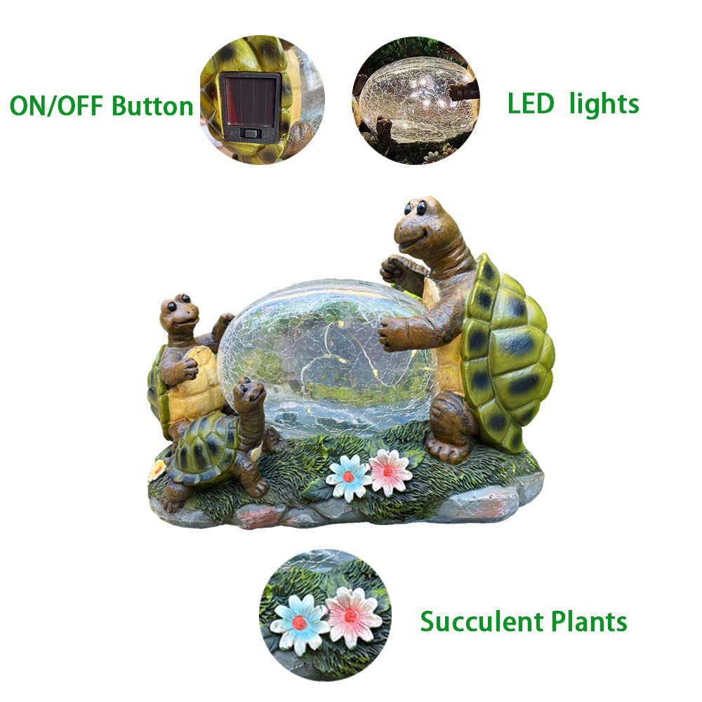 - Made of polyresin and hand Painted . These Cute Solar Turtles will sit in your garden protecting property and emitting a beautiful glow from ball at sundown, its the perfect addition to any outdoor relaxing space.