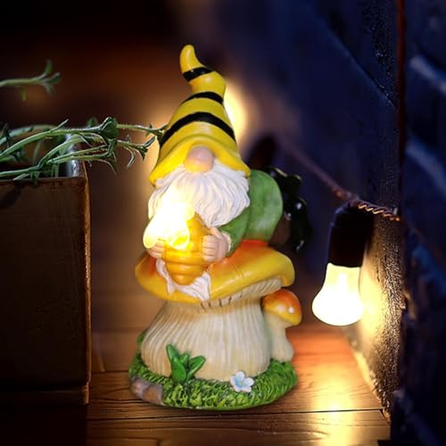 - Charming solar-powered garden gnome: This delightful resin garden gnome statue features a charming gnome lying a mushroom while holding a honey jar, adding a whimsical touch to your garden, lawn, or patio with its solar-powered