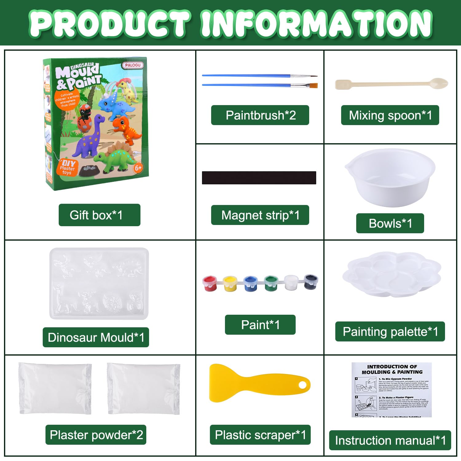 - Creative craft set: the dinosaur plaster of moulds kits for kids contains a mould with six models of dinosaurs, plaster powder, six colours, 2 brushes, colour palettes, plastic bowl, plastic scraper and manual. Get creative and paint your favourite dinosaurs with any colour you want.