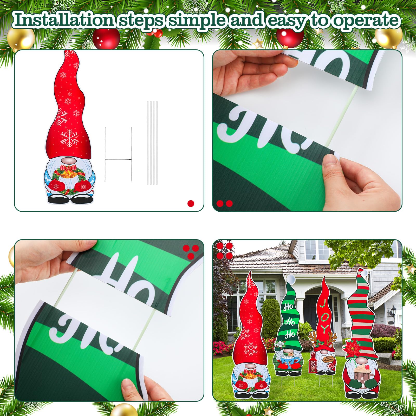 - Nice Combination: you will receive 4 pieces of gnome Christmas decor and 16 pieces of plastic stakes and 4 H-shaped metal brackets, the yard sign is approx. 39.37 x 13 inches, which is composed of 3 parts, heads, body parts and legs; The yard sign will bring joy to the Christmas party and greatly enhance the festive atmosphere
