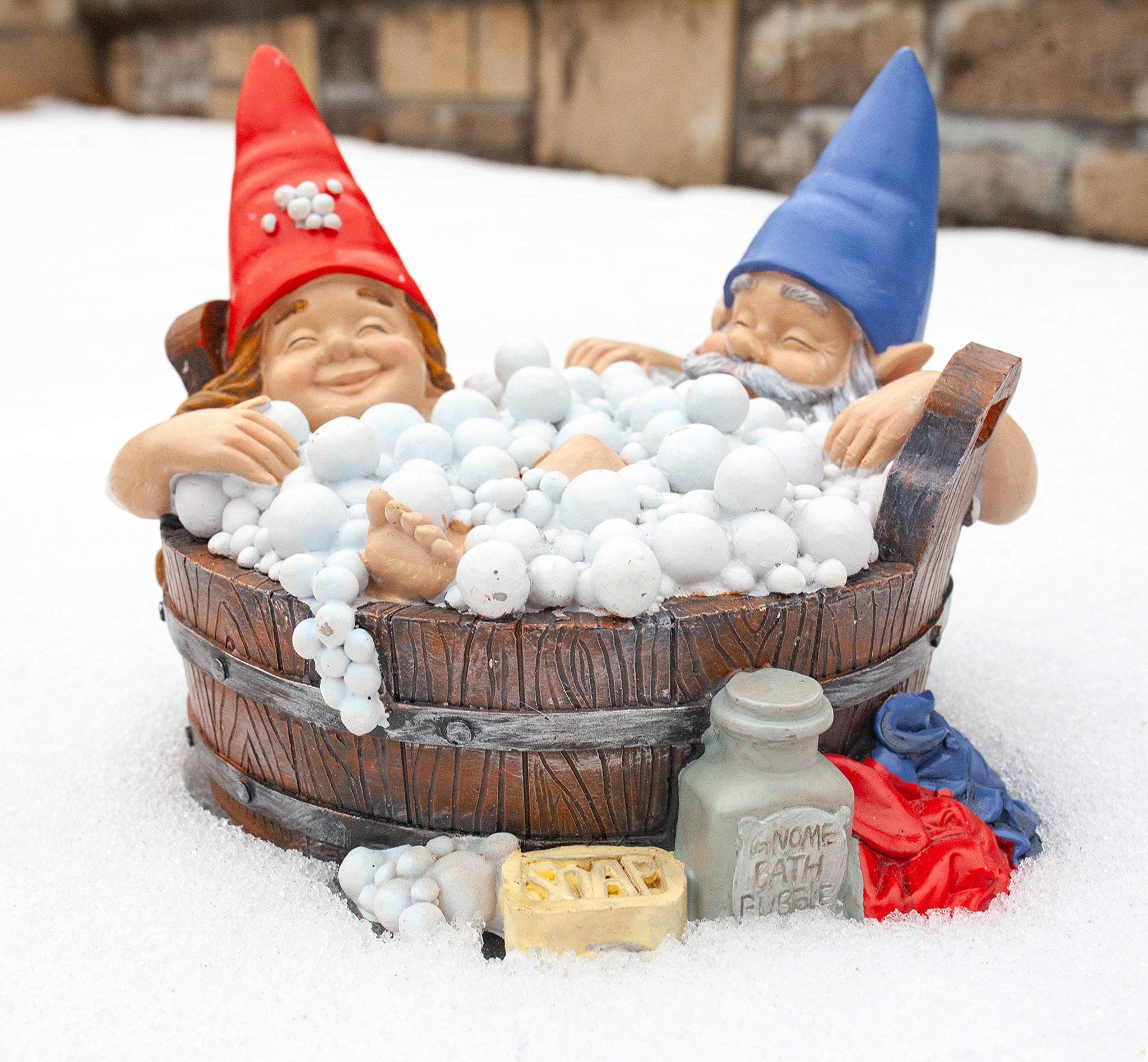 - 👑 Creative Bubble Bath Garden Gnomes : Bring a little fun and humor to your bath decor withbubble bath good time resin gnome couple. This good time gnome statue is a great way to bring out a warm smile and laughter from your guests.